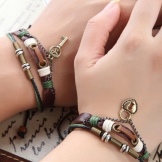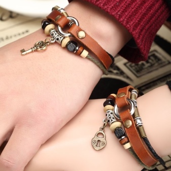 Multi-layer bracelets consisting of leather and rope, as well as a pile of metal and wooden beads and figurines. Products are identical in color and design, however, on one there is a keyhole, on the other - the key to it.