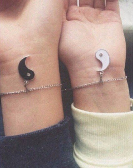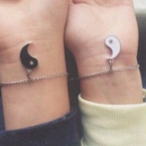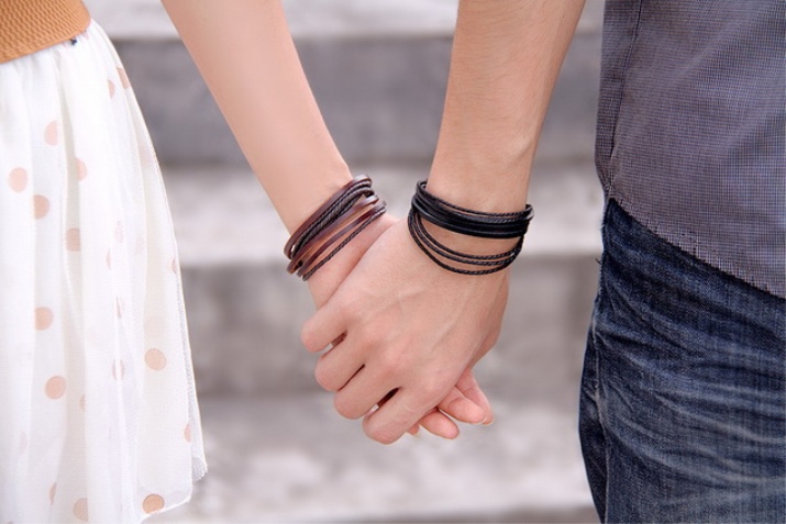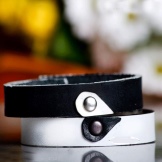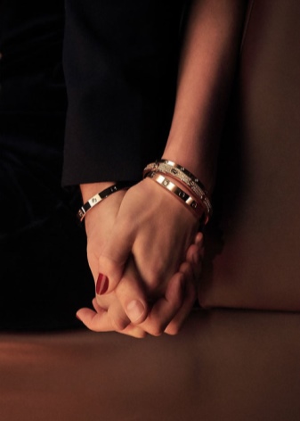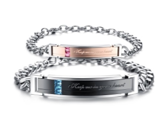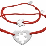 Details of the product must complement each other in meaning, so that it is clear that a single bracelet has a pair. So you can find bracelets "yin yang." This ancient symbol is disconnected into parts that can be connected to each other. Figures of a keyhole and a key, hearts and arrows, halves of a heart, mosaic pieces can be referred to a similar concept.