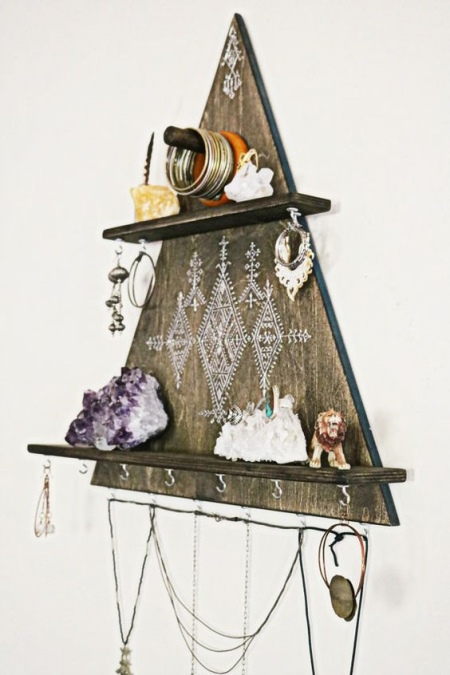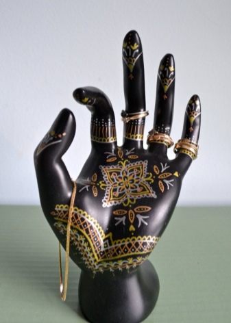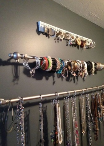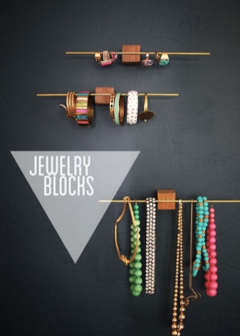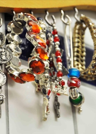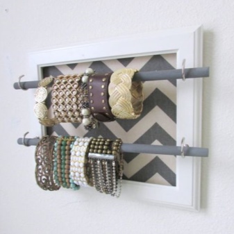 Bracelet holders are made in the shape of a hand, but this option allows you to store only a small number of bracelets. For mass storage, there are racks with small hooks that allow you to store items in limbo.