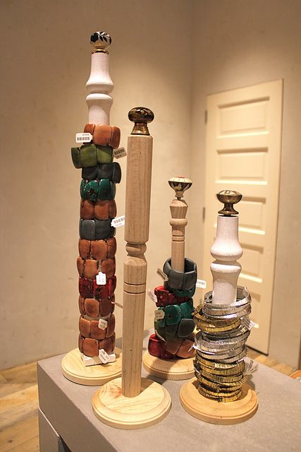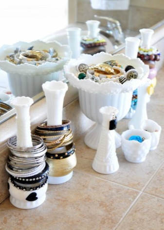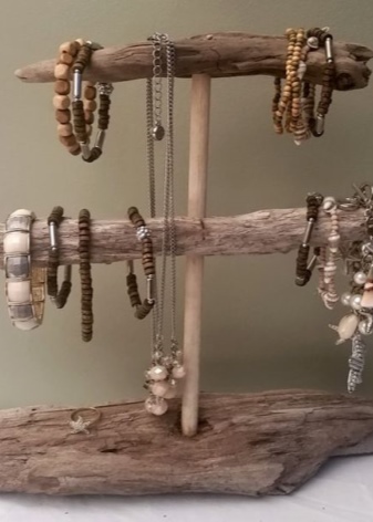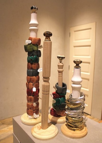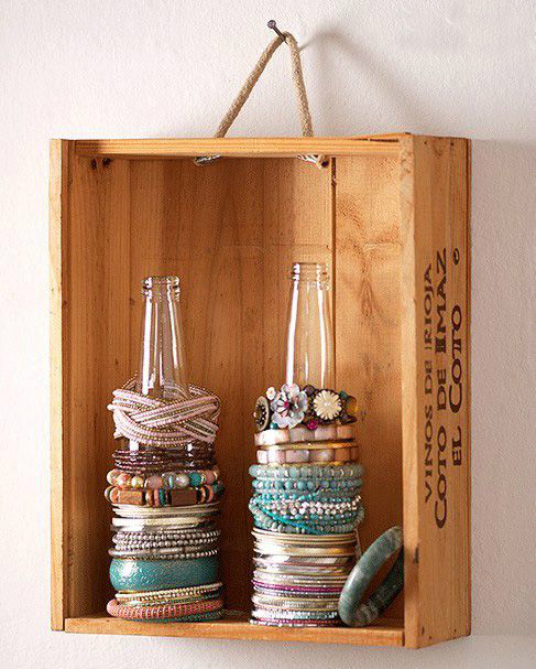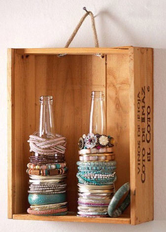 For a large number of bracelets, you can use small glass bottles of wine or carbonated drinks, on which the products will be worn one after the other. To make the device look more aesthetic, you can place the bottles in a wooden box with an open wall, painted in a light shade, or decorated with flowers.