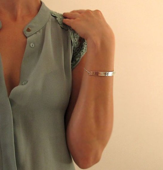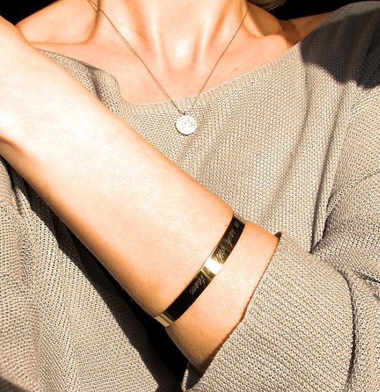 Do not pass the fashion and precious metals – gold, silver and platinum. It looks great silver with the inscription. If you like the blackened version, then it is quite possible to engrave an interesting Latin saying, because the product will be antique. An engraving on white, yellow or pink gold can be a good solution: not only is the bracelet itself luxurious, it is also a precious memory for a person. The most expensive ones are platinum jewels.