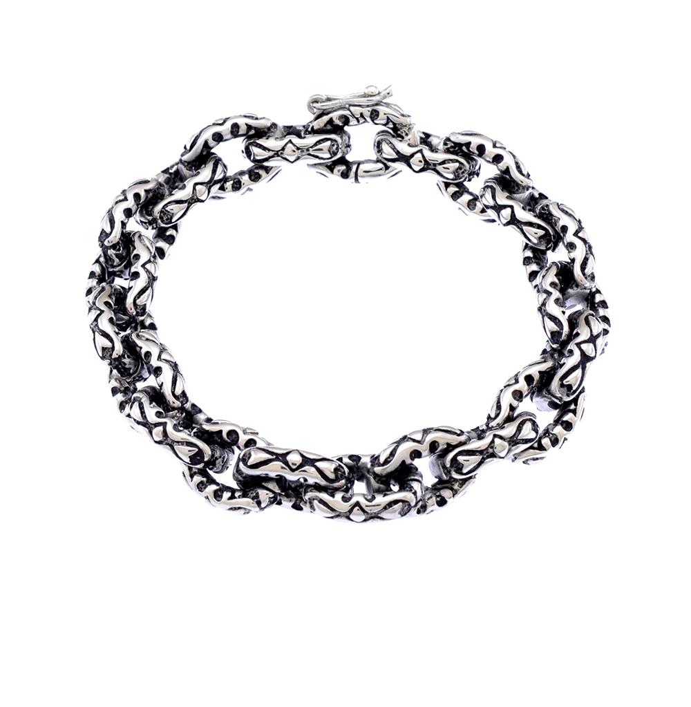 The brand produces cheap baubles made of leather with silver clasps, large bracelets made of precious metals, inlaid with stones.