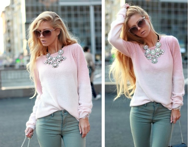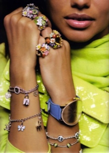 - To create a gentle youth look, you should choose a wide bracelet with stones of delicate shades. A pale pink blouse with long sleeves, light blue jeans and a large necklace will be combined with it. Supplement the kit can be a small square bag and sunglasses.