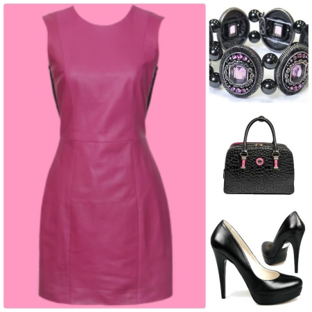 - The combination of a cocktail dress sleeveless dress of dark pink color, black shoes with a thin heel, a black varnish handbag and a bracelet made of dark silver with pink stones will look bright and effective.