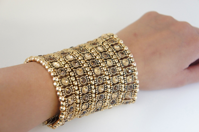 A beautiful evening look can be achieved by combining a fitting beige and black cocktail dress with a few large bracelets.