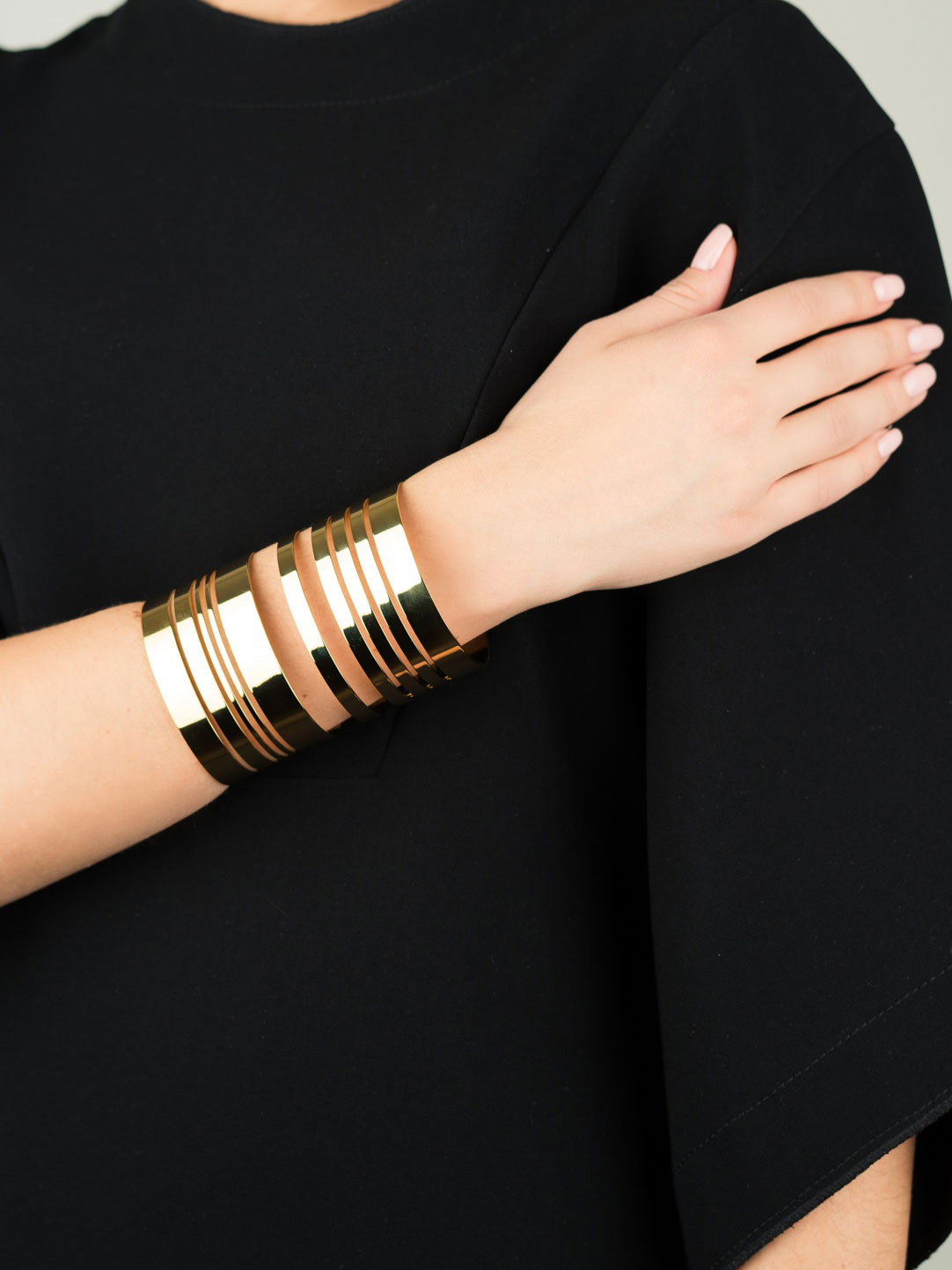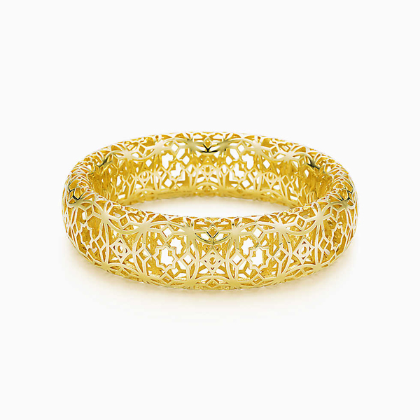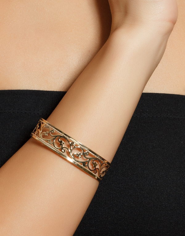 Wide bracelets, reminiscent of the decorations of the ancient Romans, can best emphasize the beauty of the female hand. Thin products will suit those who have fragile wrists. Thick or flat bracelets look very nice, but they should be the only highlight of your look. For everyday wear, you can pick up and cast models in different variations. Wonderful looks openwork cast bracelet from different types of gold.