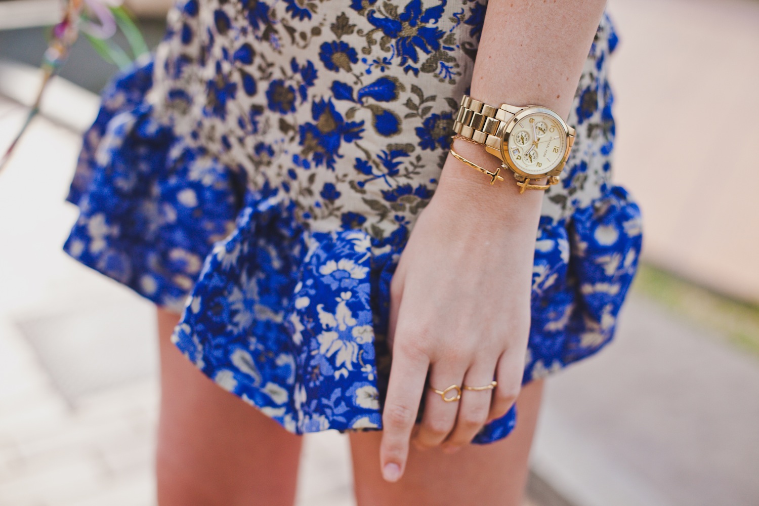 Looks great gold and floral pattern. Summer light dress can be successfully combined with a thin gold jewelry and large watches.
