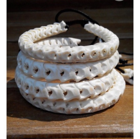The snake's spine is one of the most expensive materials used to create bracelets. Such decorations look extraordinarily beautiful, visually resemble ivory. The vertebrae are fastened together, and nylon braids are woven into both ends, with which the product is fixed on the arm.