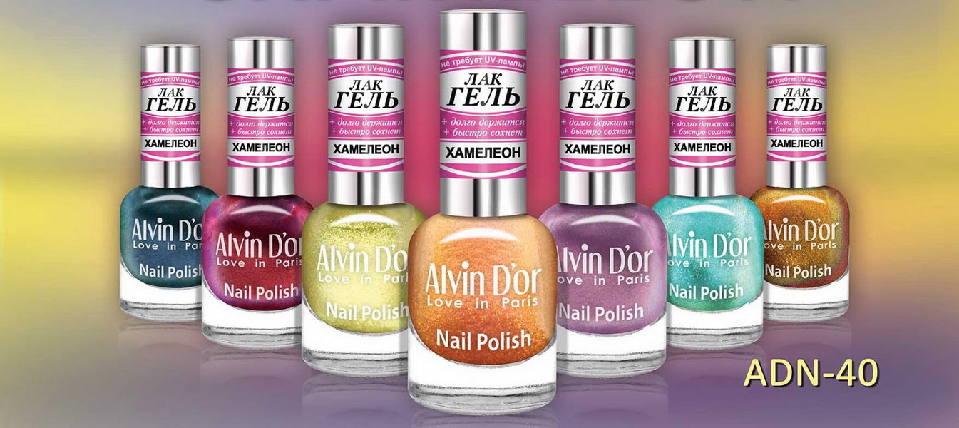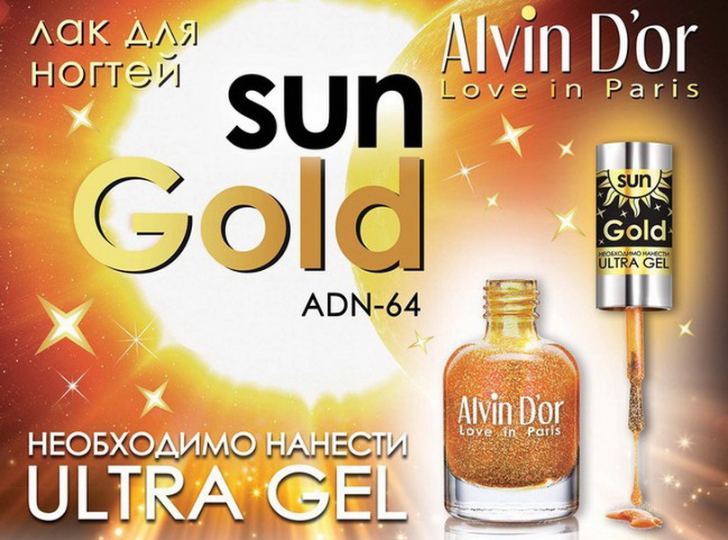 - Alvin D'or varnish series Sun Gold ADN-64 just mesmerizing with its beauty. After applying this tool on the nails, they look just great. In the composition of the smallest particles micro micrometer, thanks to which the varnish is poured with bright highlights. The line consists of 17 tones, each of which will look great on the nails.
