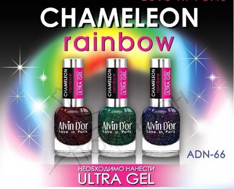 - Those who dream of an original and ardent manicure should choose varnishes from the collection. Chameleon Rainbow ADN-66. As part of the smallest flakes of foil, giving the product an unsurpassed effect. This varnish will be beautifully shimmer with all the colors of the rainbow on the nails. It looks especially impressive on round-shaped long nails. This product has a rather large volume and a very convenient brush for application.