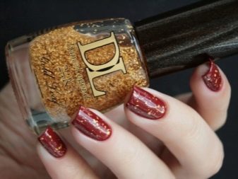 The collection includes limited top coatings with silver leaf and gold in the form of small inclusions. The particles are medium in size and quite noticeable, and when applied they are not collected on the brush, but are easily distributed along the length of the nail plate.