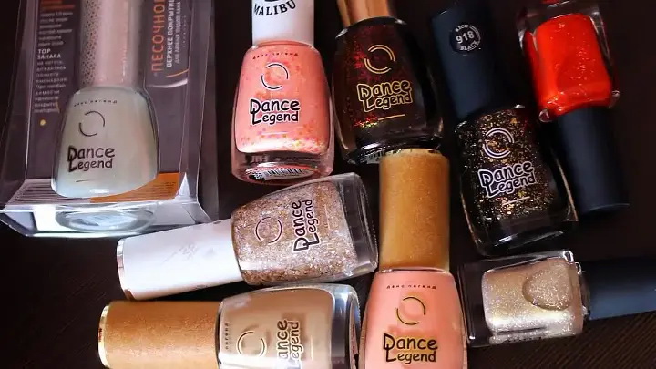 - The widest range of coatings. Dance Legend nail polishes are distinguished by a variety of shades and textures, so it is easy for any fashionista to choose the right color for your image and mood.