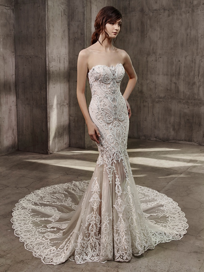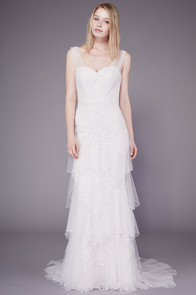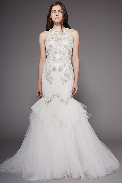 The brand also releases a collection of wedding models. The solemn and elegant cut combined with luxurious elements can make their owner the most beautiful and sophisticated. Badgley Mischka's wedding dress is a fitted silhouette, moderate use of vintage lace and ruffles, airy multi-layered skirts or a mermaid tapering to the bottom, enticing shine rhinestone, skillful embroidery, and light and cream shades of white.