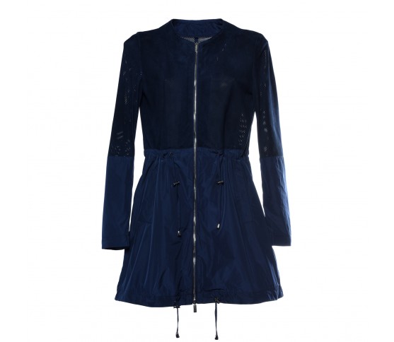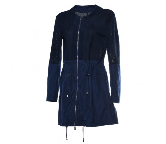 From materials, the brand uses leather and textiles. However, there are quite unusual specimens - for example, an elongated short coat made of blue suede. The model is fitted, and will look great on the ladies with a slim figure.