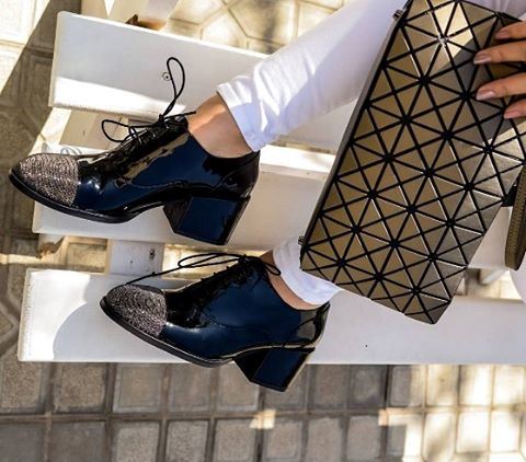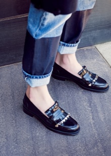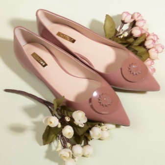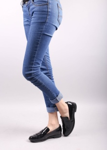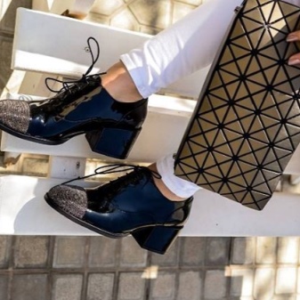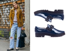 Popular and styles of leather with a metallic sheen. Often, such products have a low wide heel and are complemented by a cord with a metallic effect, as well as a golden-colored chain. The nobility of such models adds a black tint to the inside. The shape of the toe can be pointed or rounded.