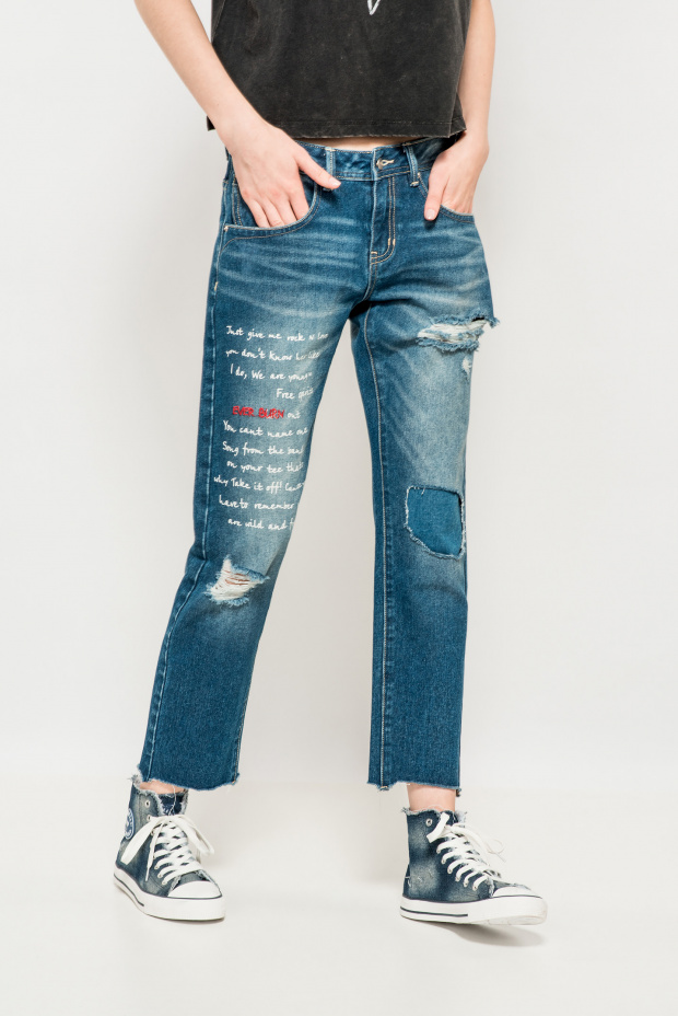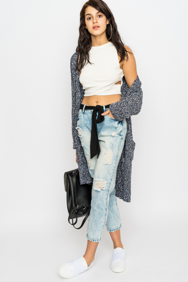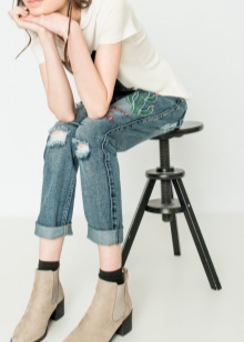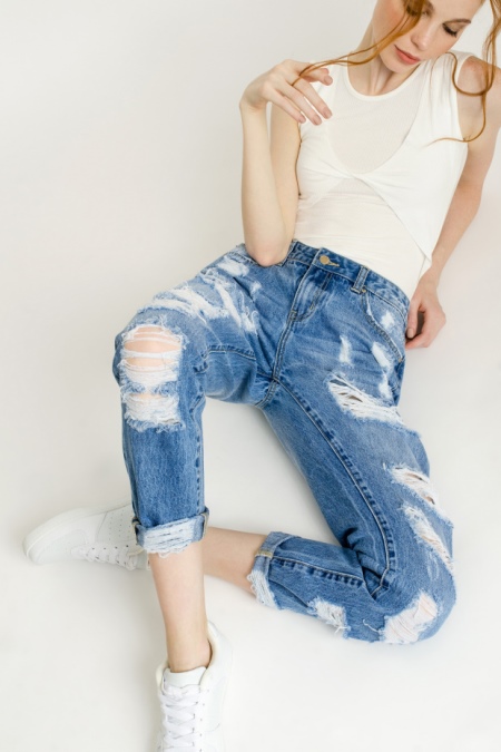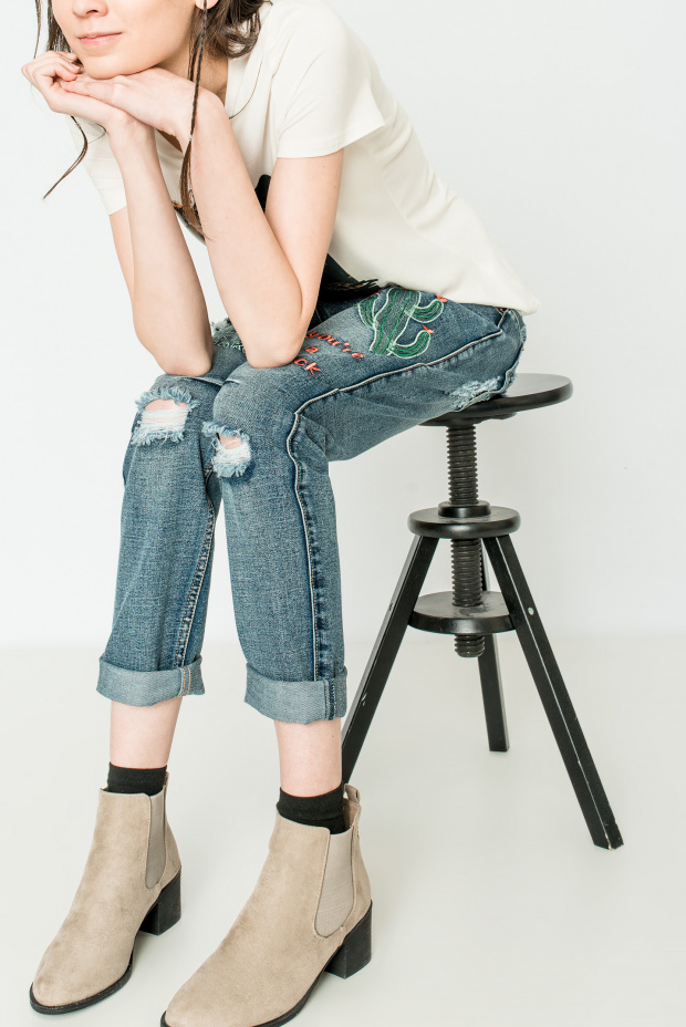 This season in trend is wide or straight jeans with high and medium fit. Actual length 7/8. An interesting element is a ragged bottom, complemented by a still uneven cut. Ripped jeans are still in fashion.