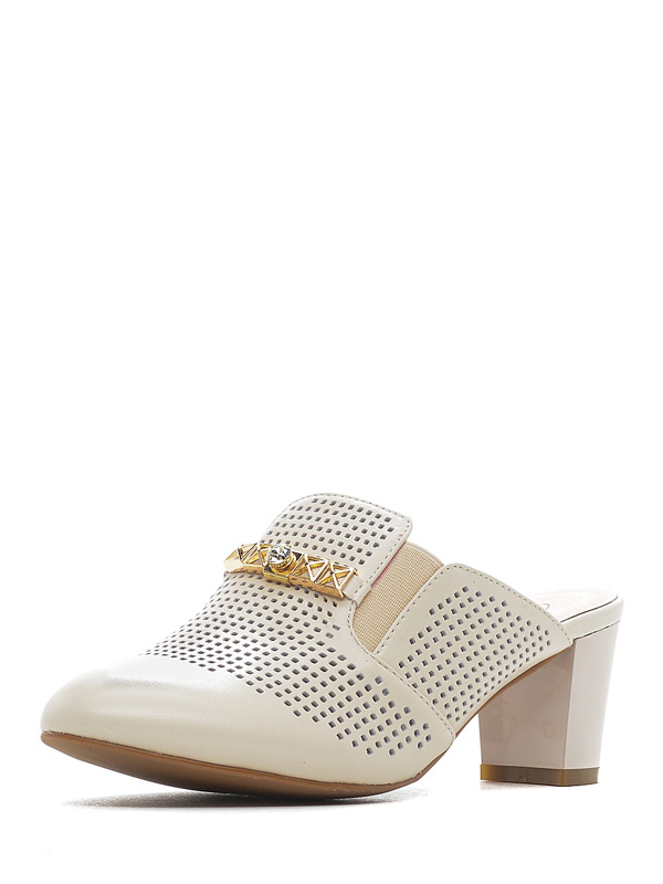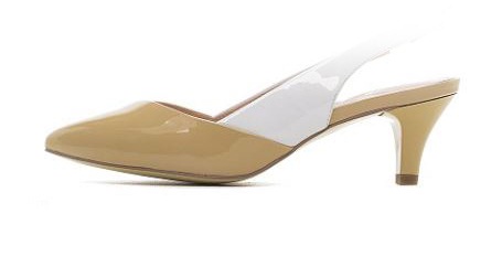 The combination of white and beige color in patent leather sandals, with a closed toe on a steady elegant heel is a great option for summer.