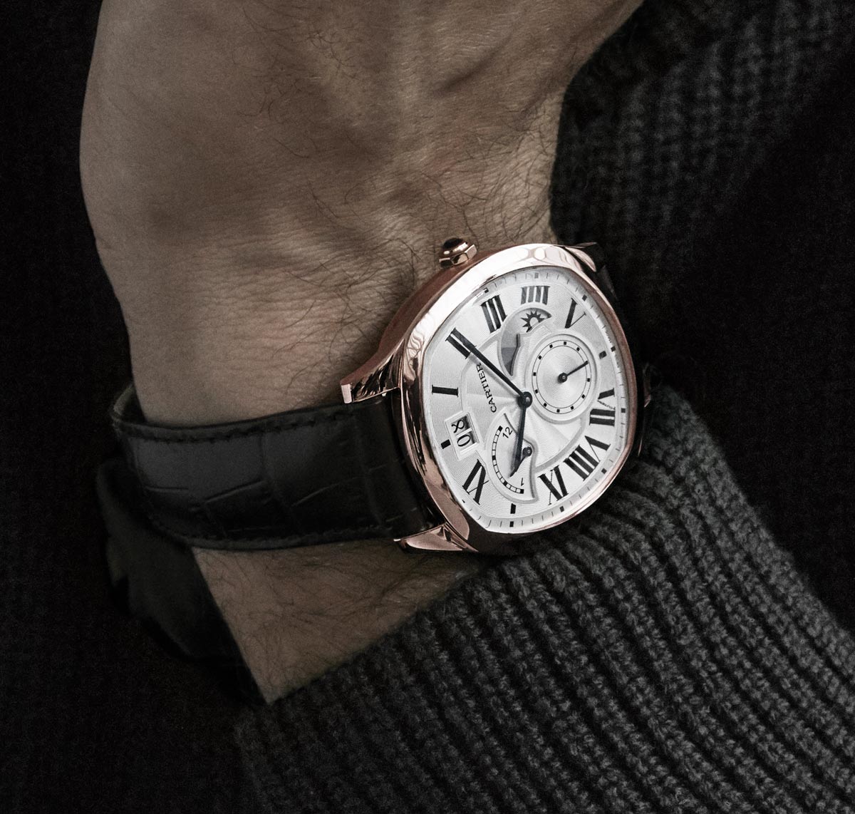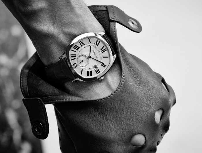 - Drive De Cartier is the choice of a real man, strong, courageous and self-confident. The dial with large Roman numerals, having the form of a soft square, is enclosed in a gilded case. A wide leather strap will help to focus on strong and strong male hands.