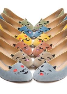 The most creative and vibrant collection of shoes and accessories decorated with cats faces. All shoes are made in bright colors - orange, green, blue, yellow, blue. The collection includes sleepers, ballet flats, clutches, bags.