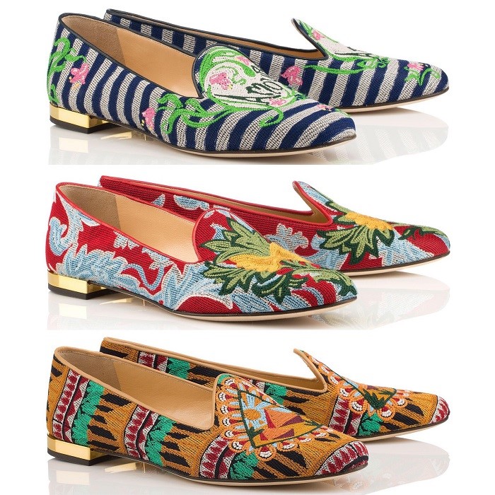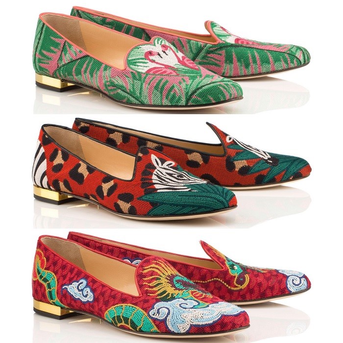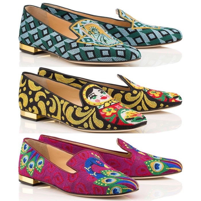 The line of shoes on the theme of travel Wish You Were Here, dedicated to the landmark for the designer cities and countries. Including, there are sleepers with the image of dolls (Russia), rosebuds (Great Britain), and sakura flowers (Japan). In addition, the collection includes sleepers with dragons, reminiscent of Hong Kong, as well as a pair of shoes with the inscription Amour, created after a visit to Paris by the designer.