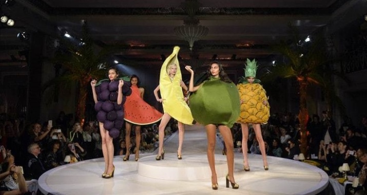 In addition, at this show, everyone remembered very much models dressed in exotic fruit costumes - strawberries, pineapple, watermelon, grapes. Accompanied by their dancers, dressed in gold swimsuits and dancing can-kan.