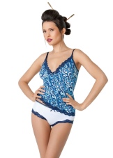 Tankini is a set of T-shirts and closed pants. Luxurious model beautifully emphasizes the neckline and allows you to hide a few extra inches in the waist and abdomen.