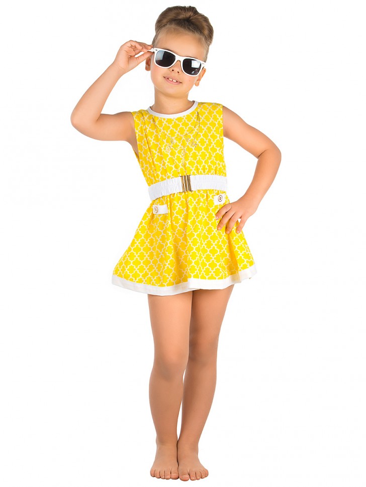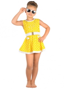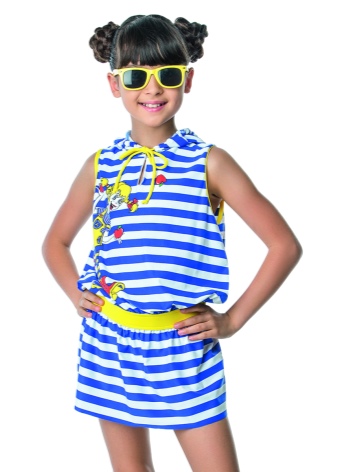 Original beach sets for girls consist of light, airy dresses and swimsuits. In such clothes, a little princess will be comfortable playing and running along the beach. In other variants of such sets, the dress is replaced by a charming hooded tunic.