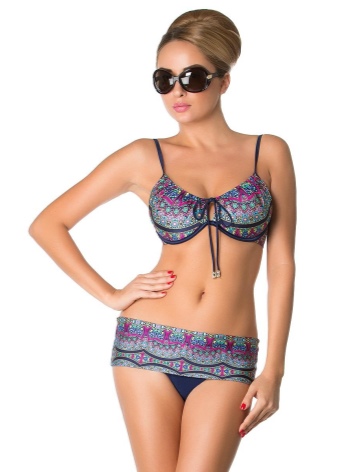 Panties can have different fit: high, low, medium. These swimsuits are designed for women of different ages and body types. Models are decorated with buckles, ties, ruffles, bows, inserts of contrasting colors of materials.
