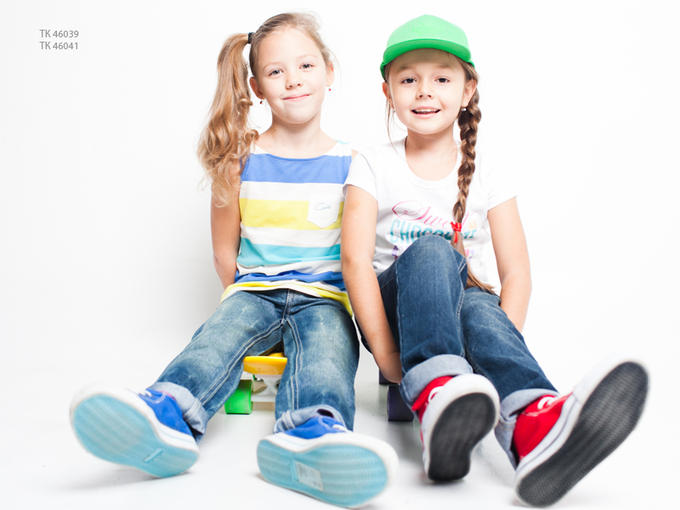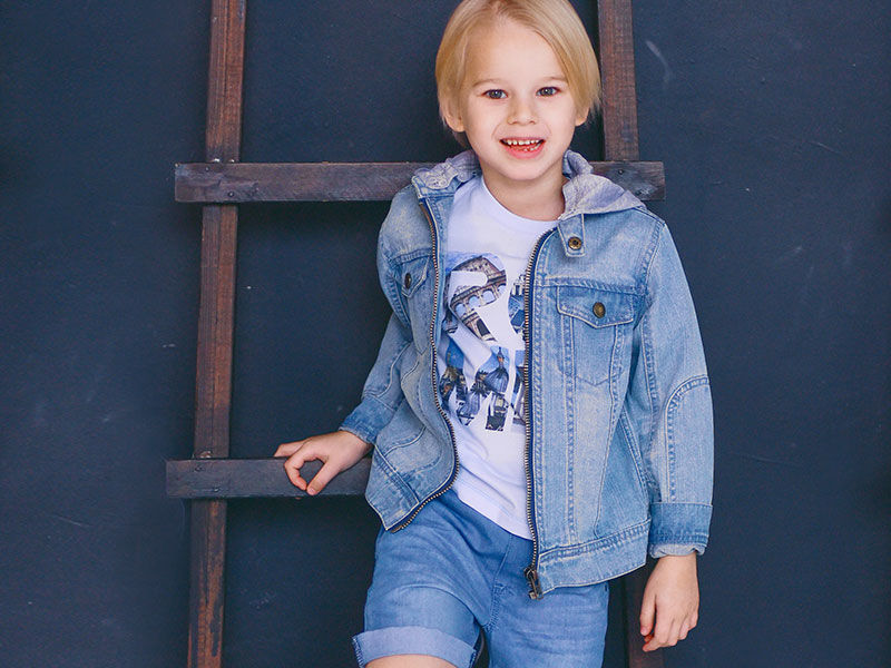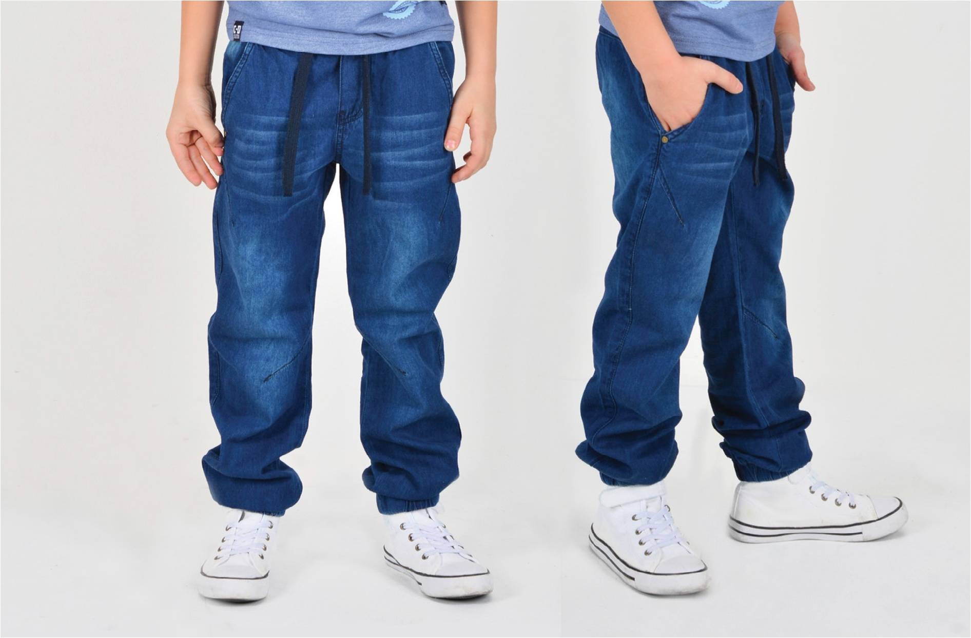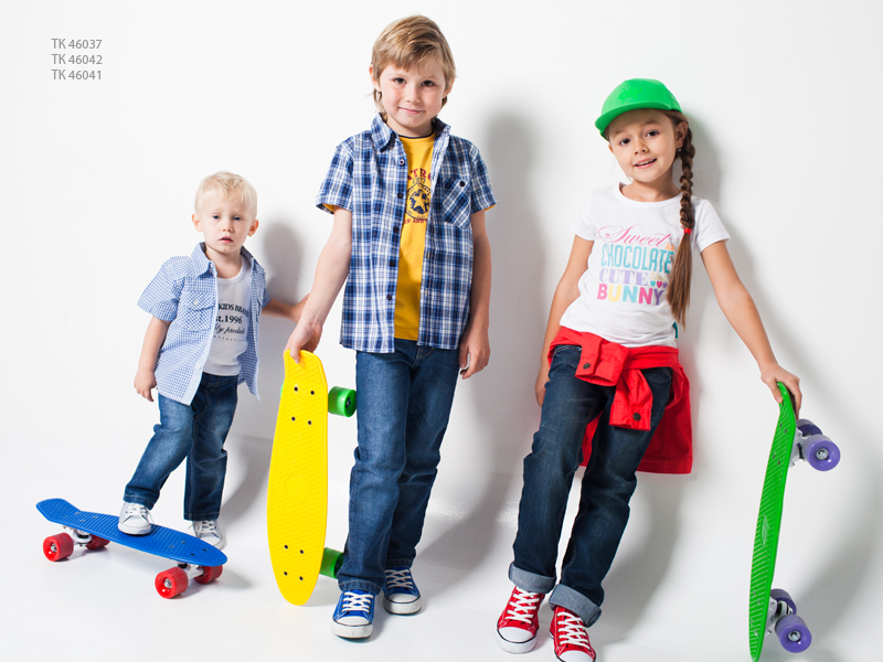 The most popular denim option is jeans. Options for this model of denim trousers for kids are different from the options for older kids. For the smallest ones, a lightweight model has been developed; elastic belts with keeper tape in the belt, lower trouser legs or assembled with elastic or cuffs sewn on. For older children, models of direct cut with a stitched belt, in which an adjustable elastic band is sewn.