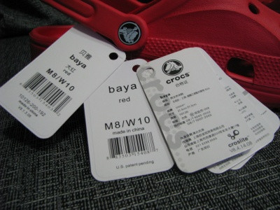 - Complete with real crocs always have labels with the name of the product, information about the size, brand, material, etc.