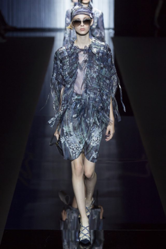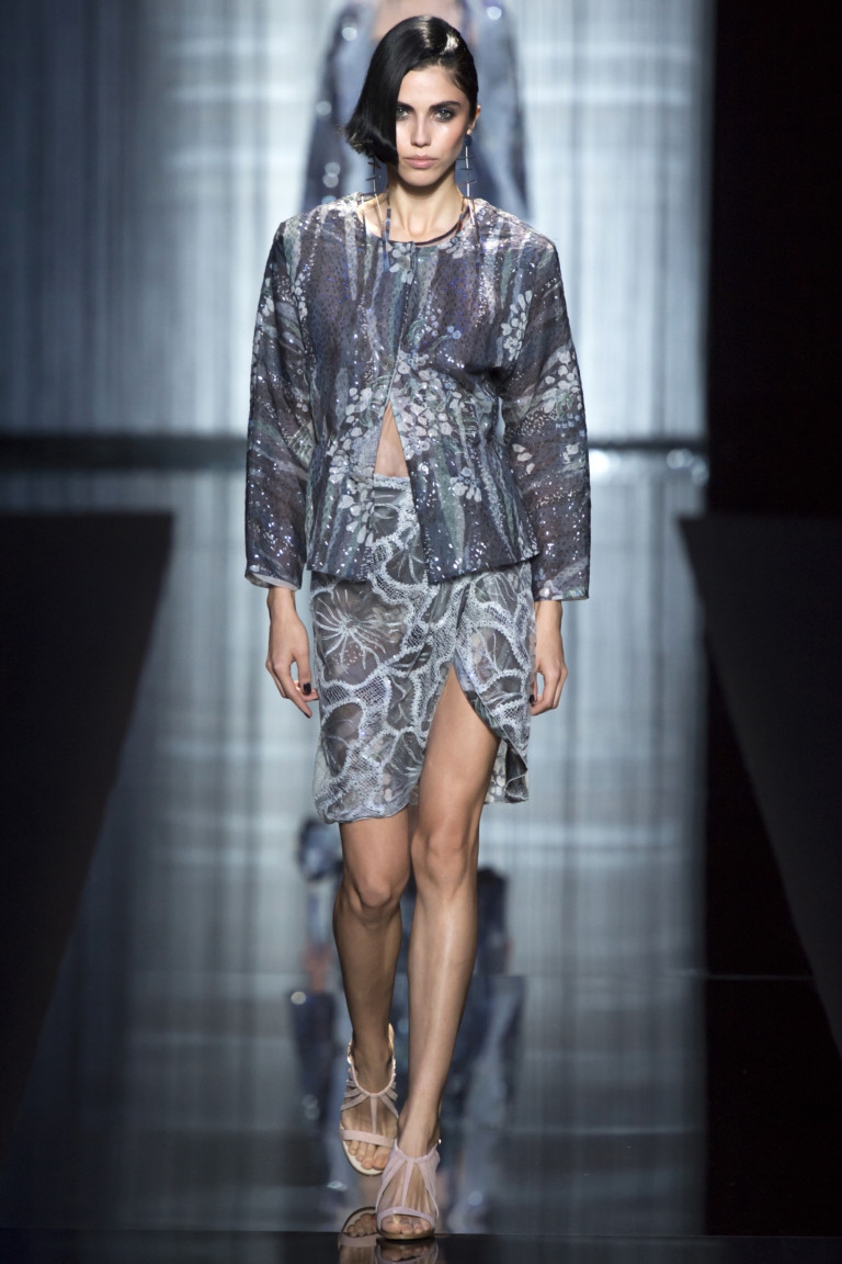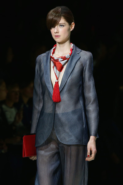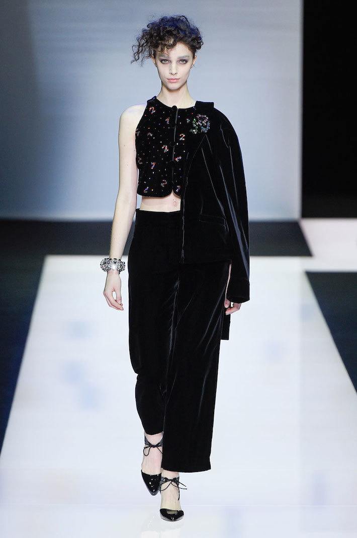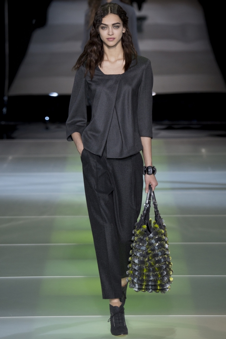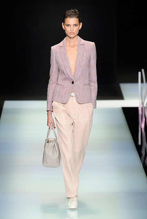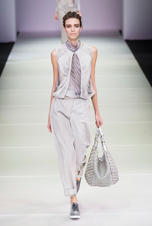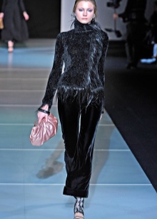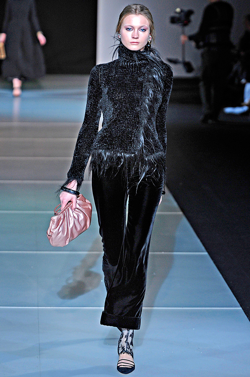 The brand is not engaged in the production of textiles for their collections.All the necessary materials for the Fashion House are purchased from suppliers specializing in supplies exclusively for Armani. These are high-quality, luxury textiles: noble varieties of natural suede, cashmere, wool and velvet, iridescent silk and sparkling satin.