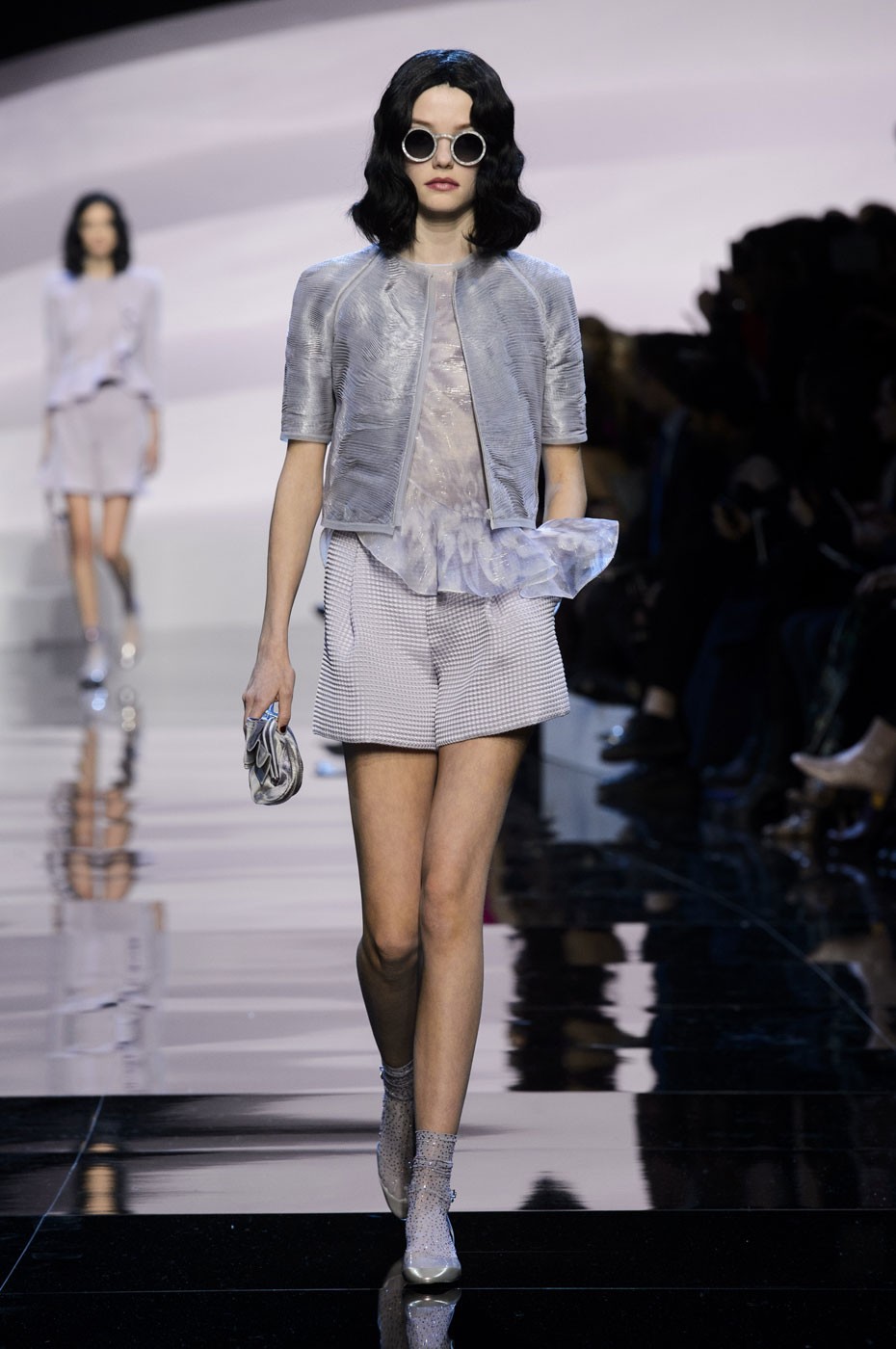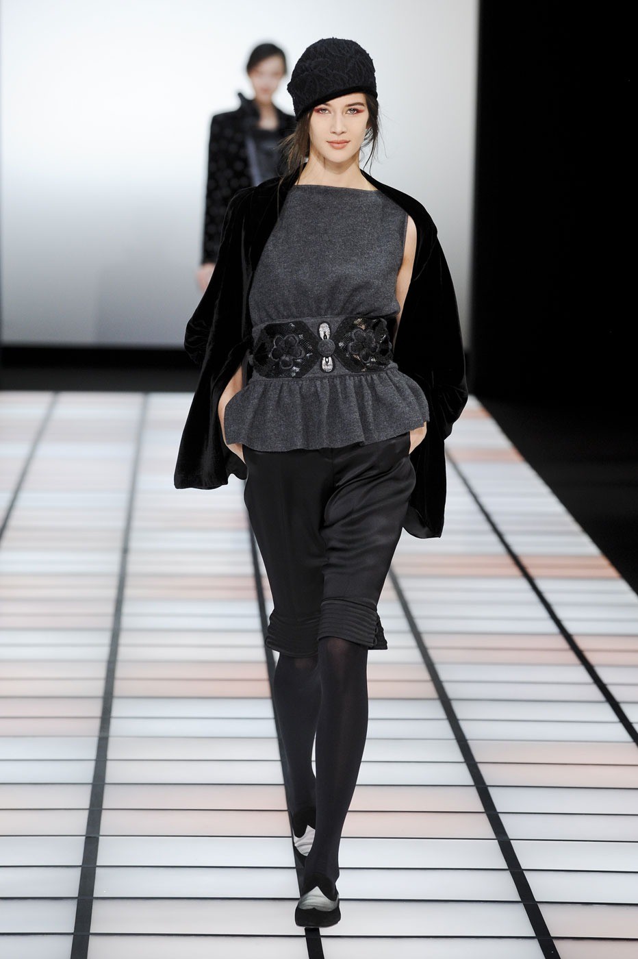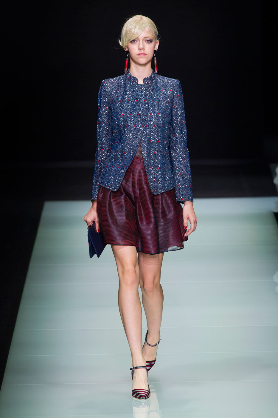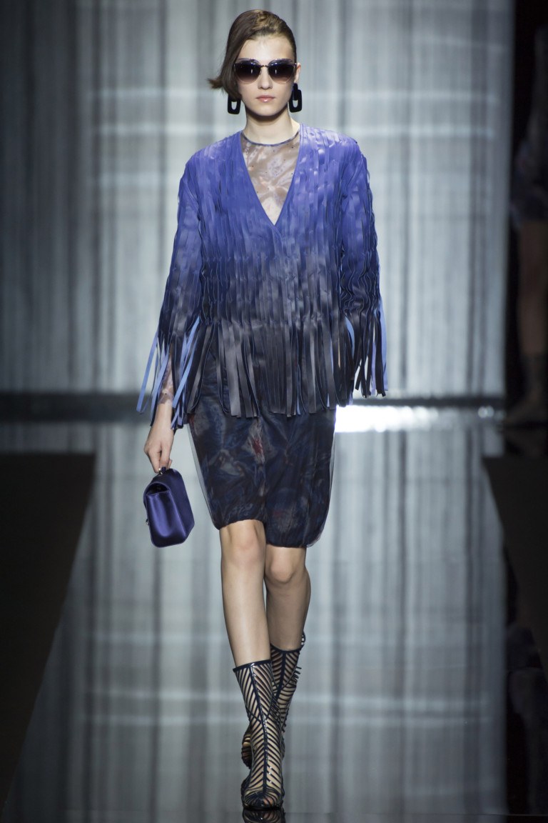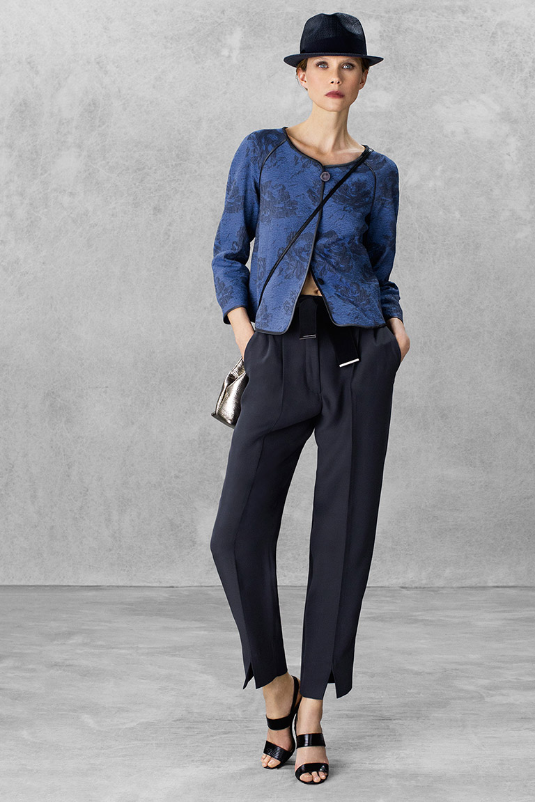 The brand is not engaged in the production of textiles for their collections.All the necessary materials for the Fashion House are purchased from suppliers specializing in supplies exclusively for Armani. These are high-quality, luxury textiles: noble varieties of natural suede, cashmere, wool and velvet, iridescent silk and sparkling satin.