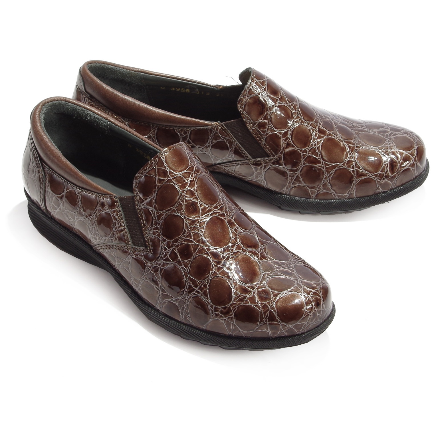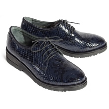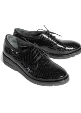 The brand makes original shoes with leather, decorated with imitation crocodile or snake skin. Such products have a varnished surface and look very expensive.