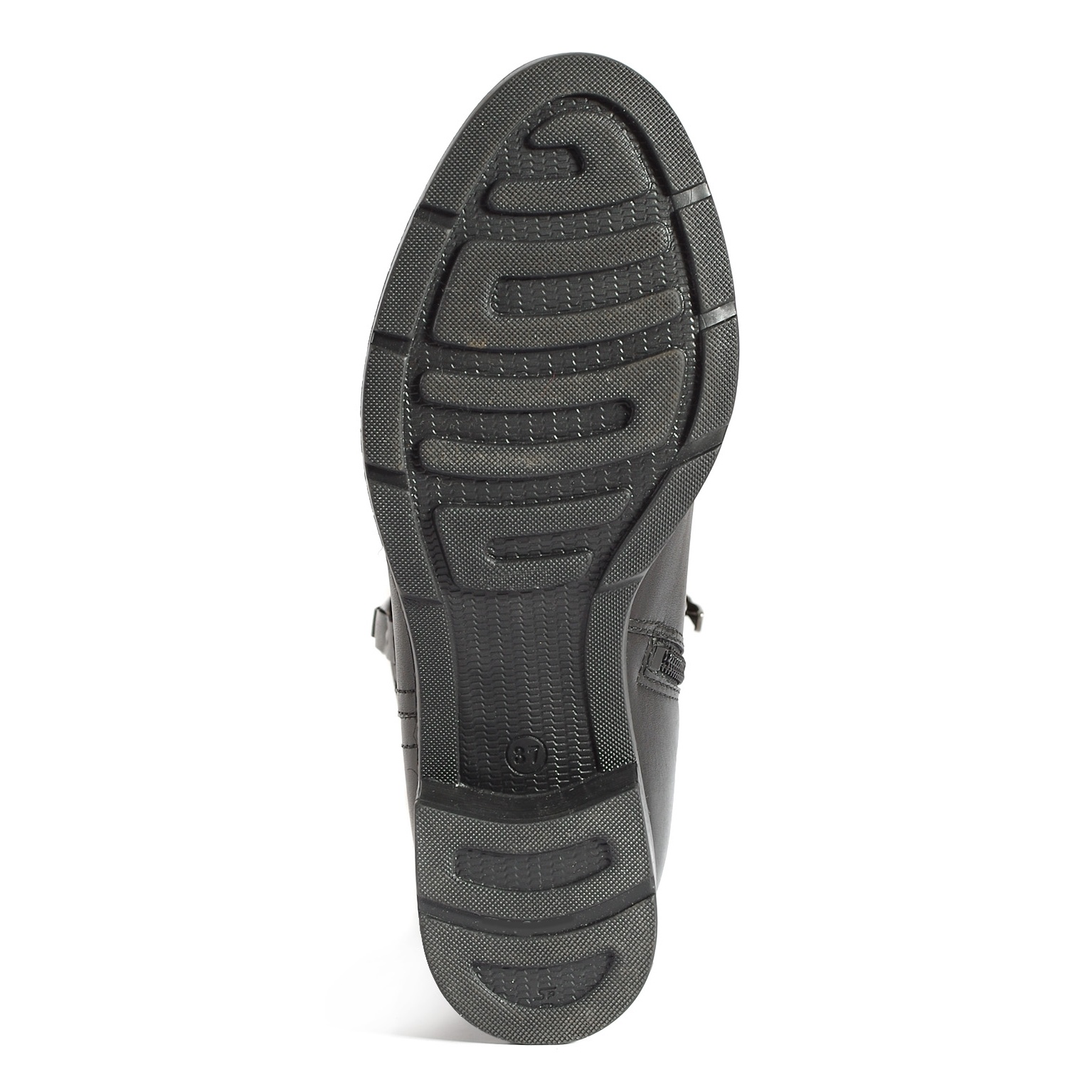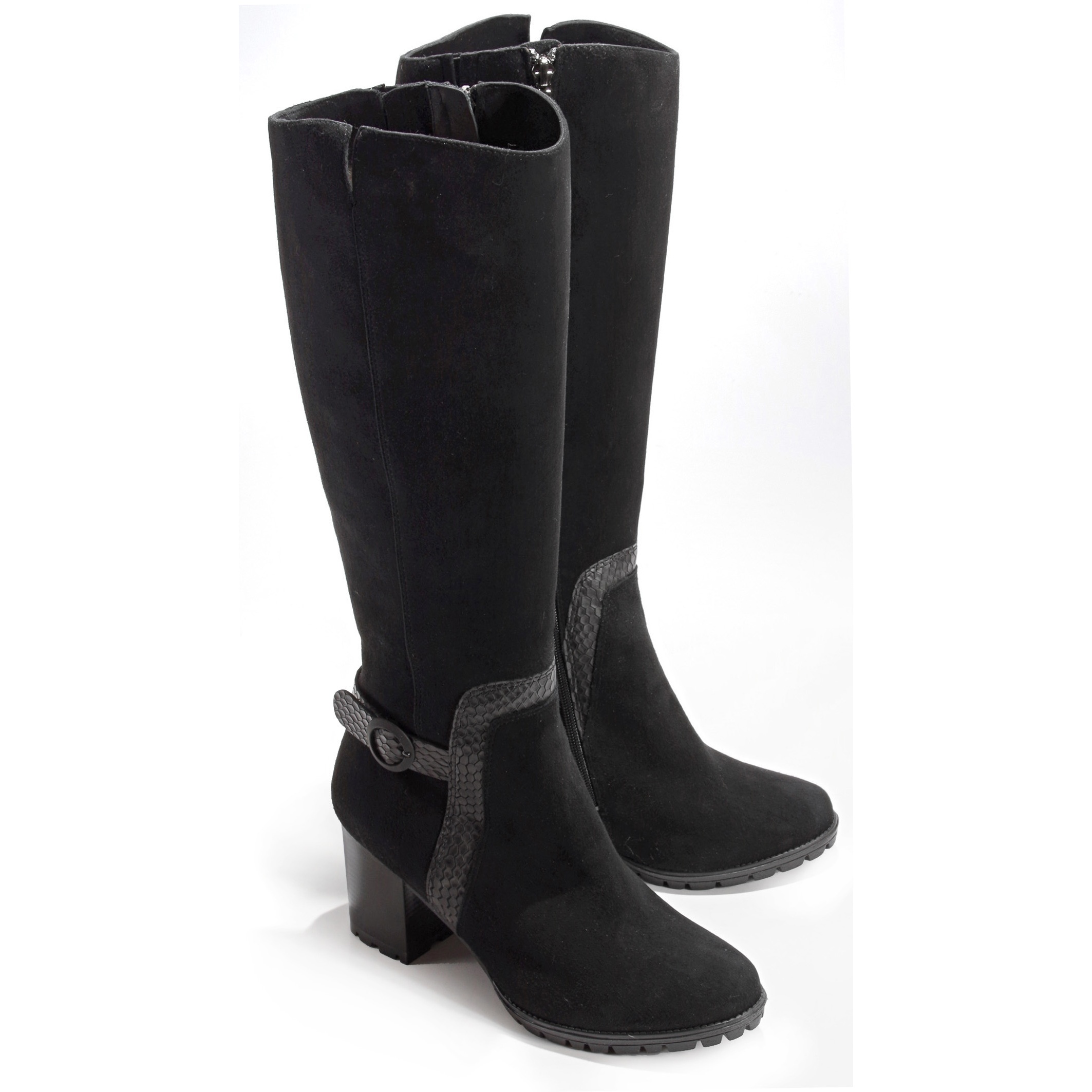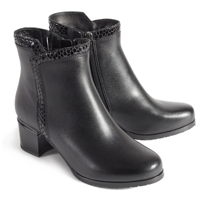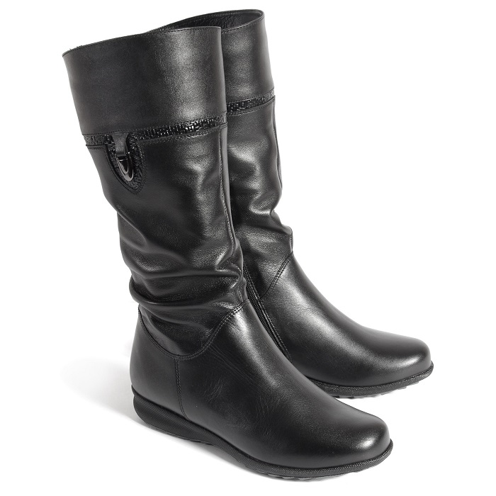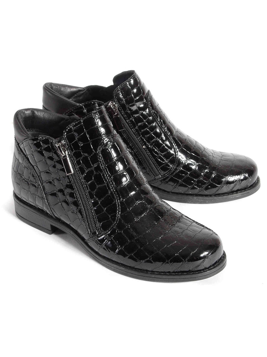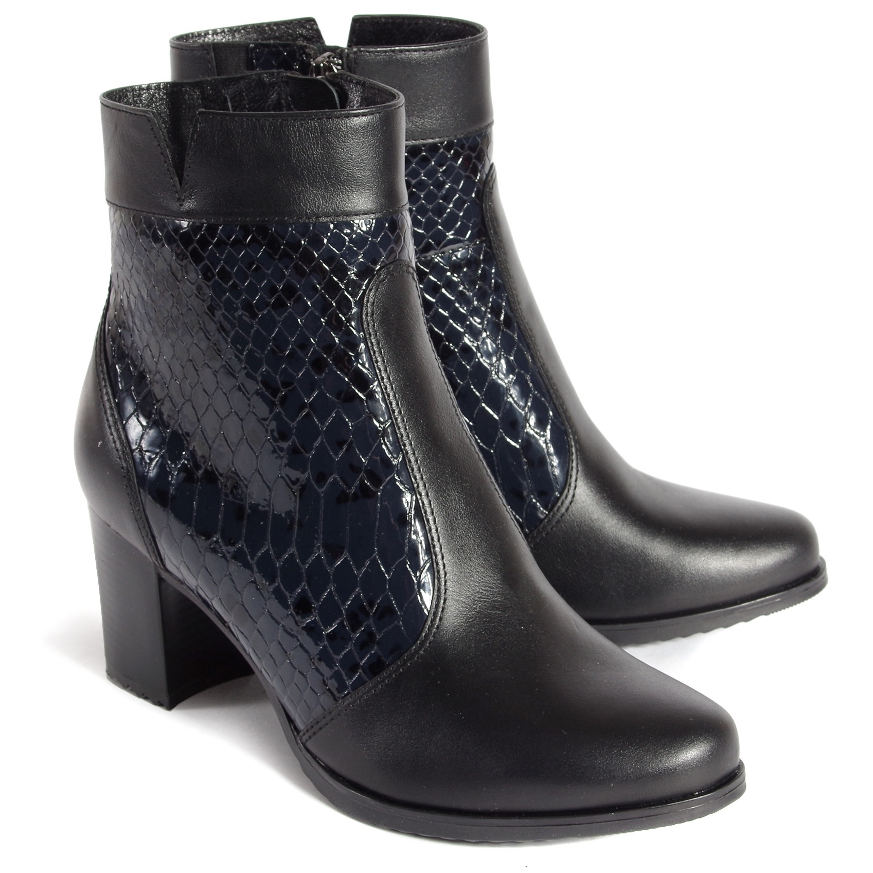 Particularly stylish and expensive look high boots from matte leather with lacquered inserts that mimic the skin of reptiles. They will look spectacular with many ladies attire.