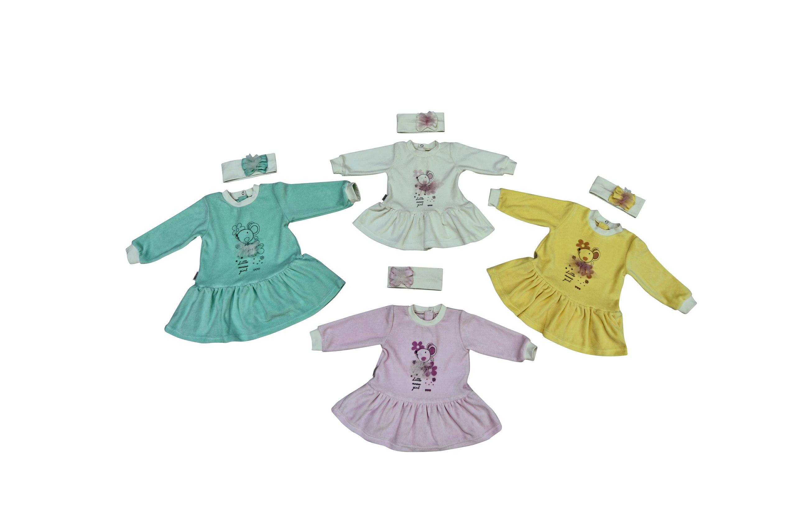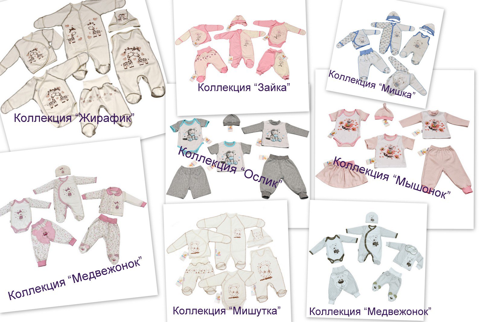 The company offers several thematic collections for young children. There are various items of clothing, decorated and decorated in accordance with the chosen theme, for example, "Giraffe", "Bunny", "Mishutka", "Donkey", "Little Mouse".
