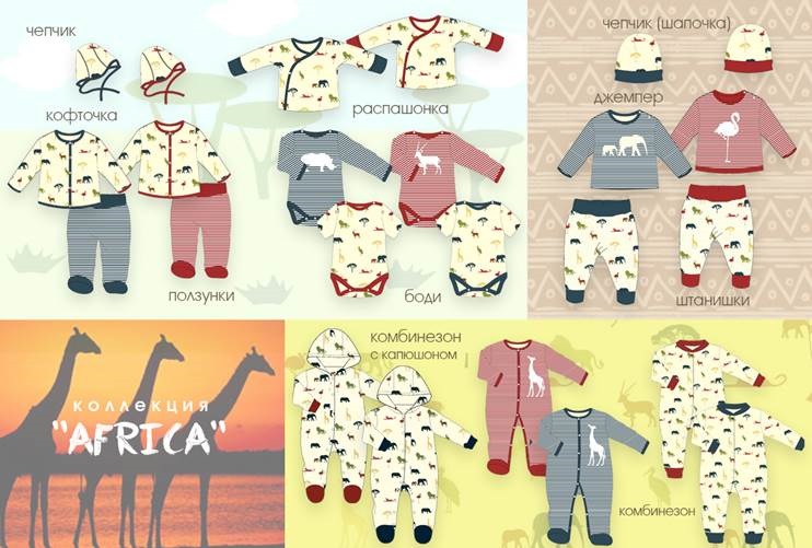 The company produces overalls for different ages, taking into account the preferences of both girls and boys. Jumpsuits for babies are made from 100% cotton. They are presented in different colors. Some models are decorated with a large pattern, others - with a small print. Names of jumpsuits say a lot - Eared hare, Africa, Penguins, Zzzveriyat, geometry, etc.