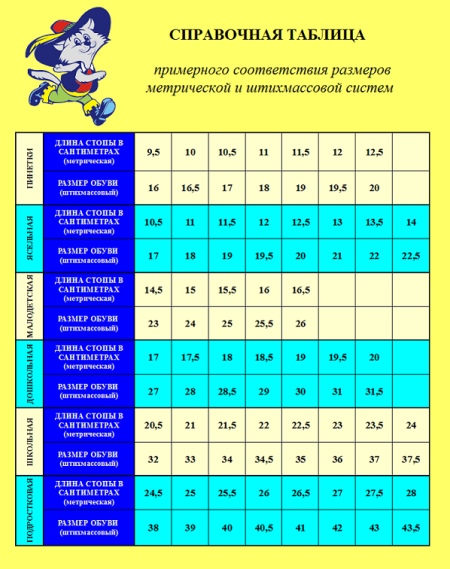 The table in two lines shows different scales for sizing. Metric corresponds to the length of the foot. It is usually denoted by a three-digit number. Size pitch is 5 mm. For the compact mass scale, the standard is 6.67 mm.