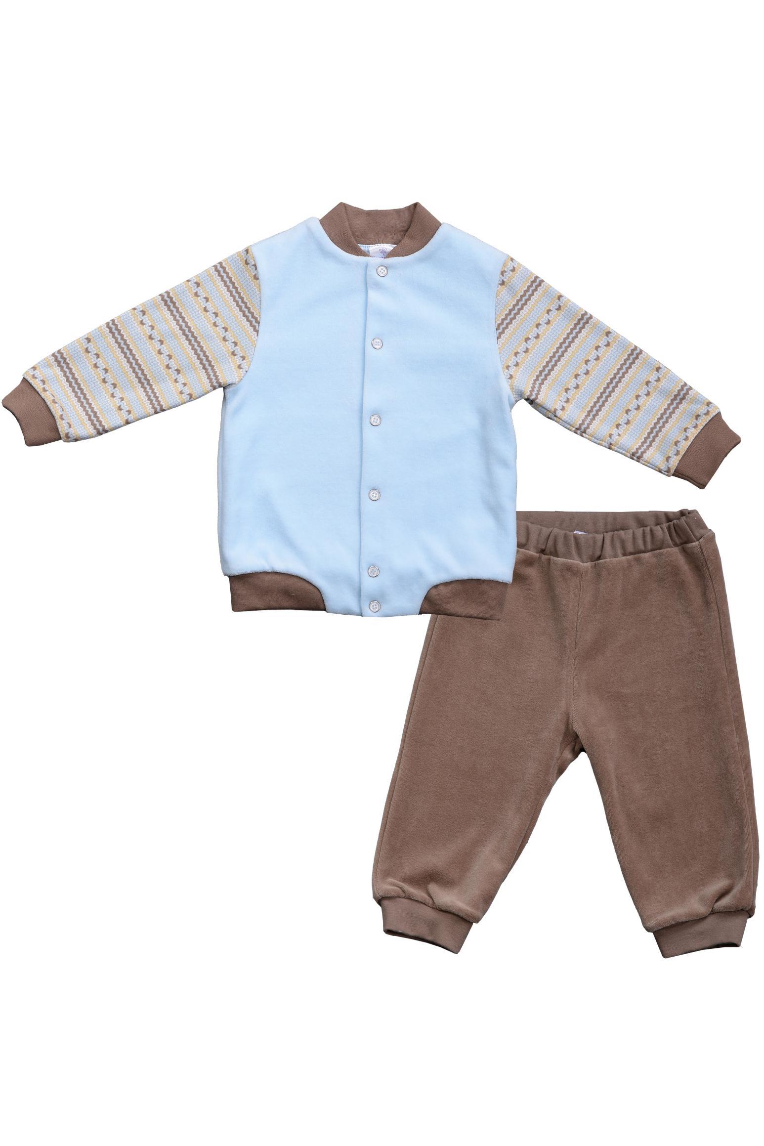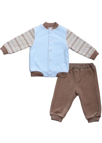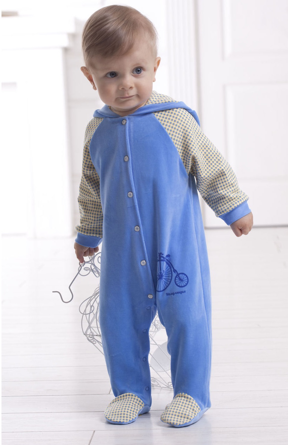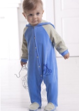 - Overalls from velor with a hood and on buttons. It is decorated with a pattern inside the hood, on the toes and sleeves. White cotton fabric is used as the lining.