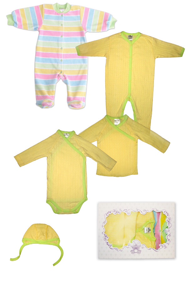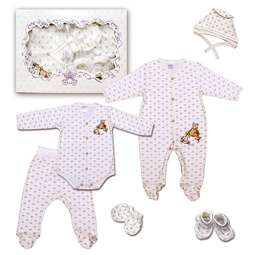 Separate attention deserve gift sets called "Toys Ecru". They include everything you need for a newborn. The complex includes booties, scratches, cap, romper suit, long-sleeved bodysuit and jumpsuit. All clothes are made from quality material that lets air through and retains heat. Overalls and body have buttons for easy donning.