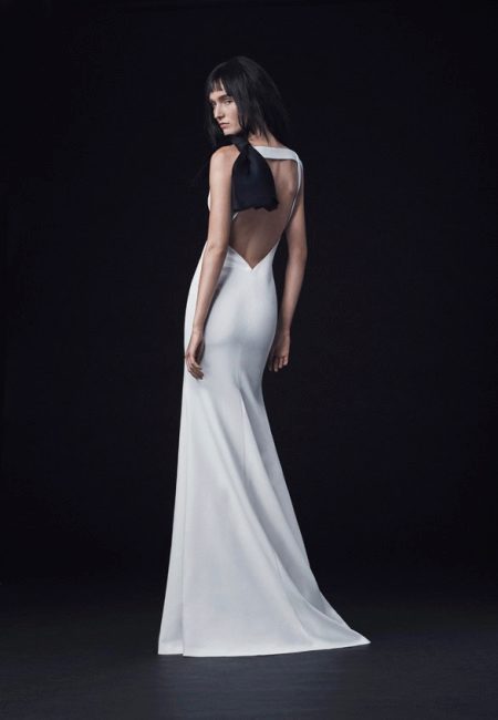 Girls with a good figure can afford a gorgeous dress with an open back, perfectly emphasizing the curves of the female figure. Satin models, complemented by a volume bow or a flower that serves as an accent of the image, look gorgeous.