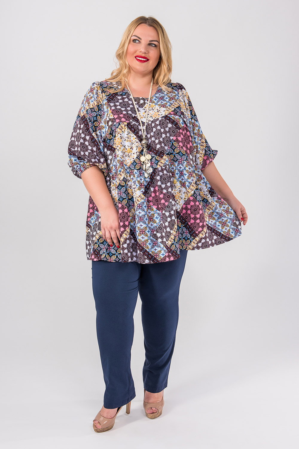 Designers of the company rightly believe that large-sized women's clothing is not necessarily loose clothes and shapeless tunics of restrained colors. Fashionable, bright dresses, sweaters, skirts, jumpers will help to effectively emphasize luxurious shapes and correct minor figure flaws.