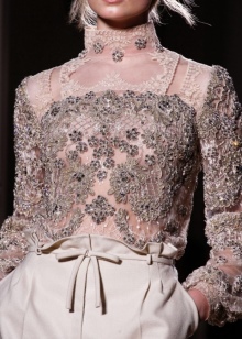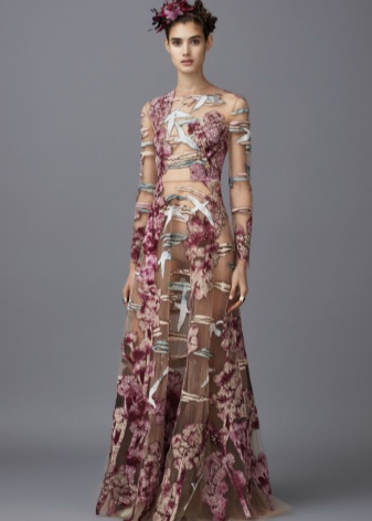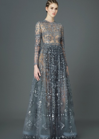 The collection of evening dresses with long sleeves made of translucent, delicate mesh fabric is a work of art. The skirt part is decorated with an ornament embroidered with decorative threads or lined with precious stones of different sizes.