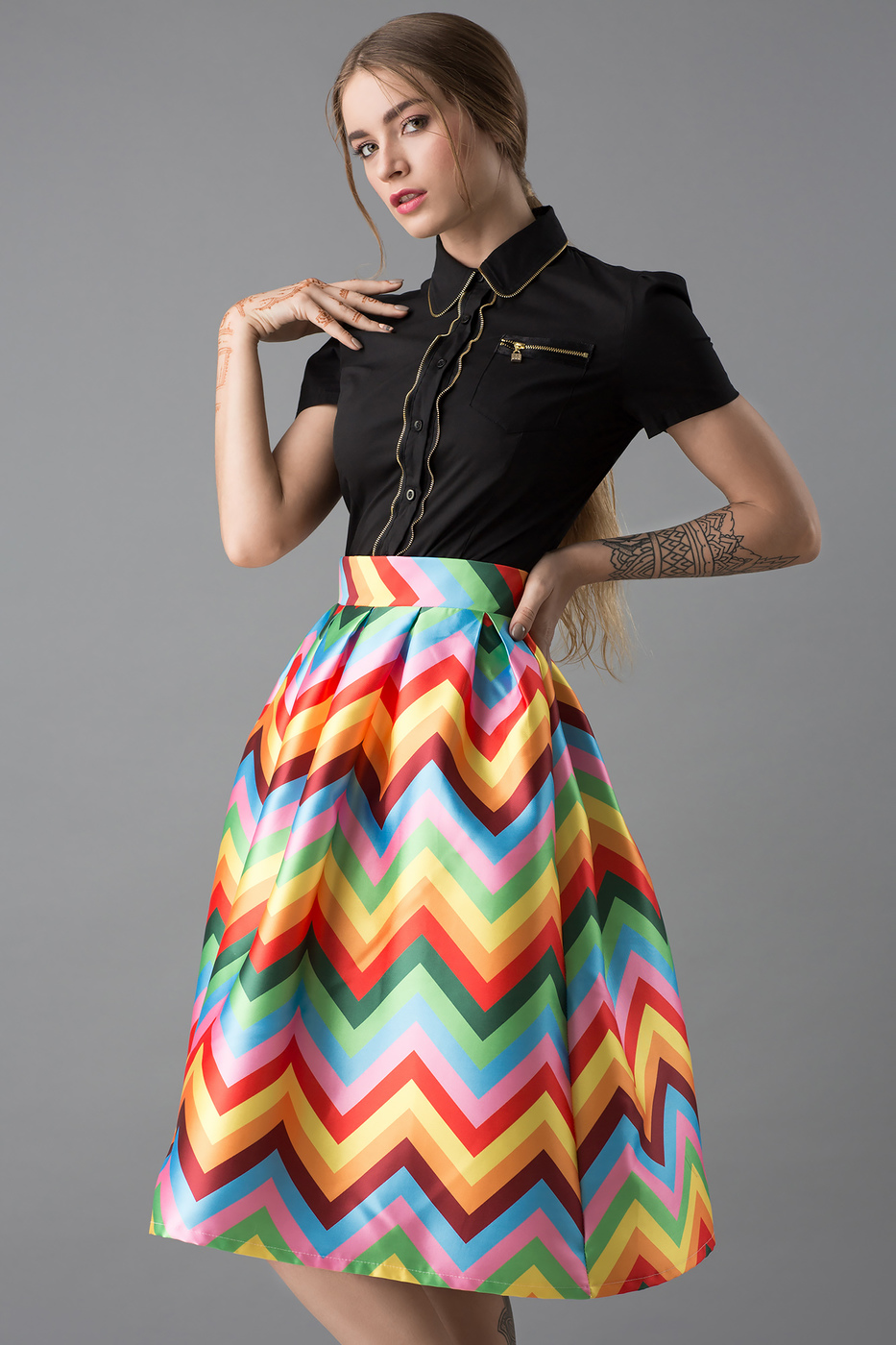 Popular lace, pleated skirts and unusual models with pleats and bright inserts. This skirt will suit any fashionistas.