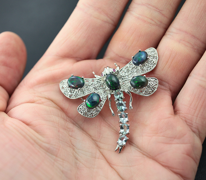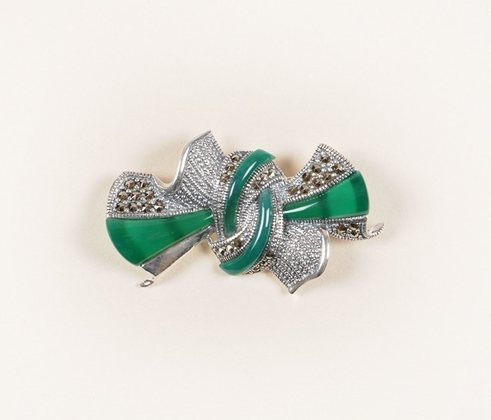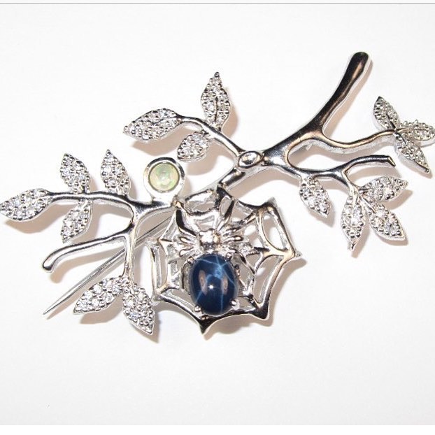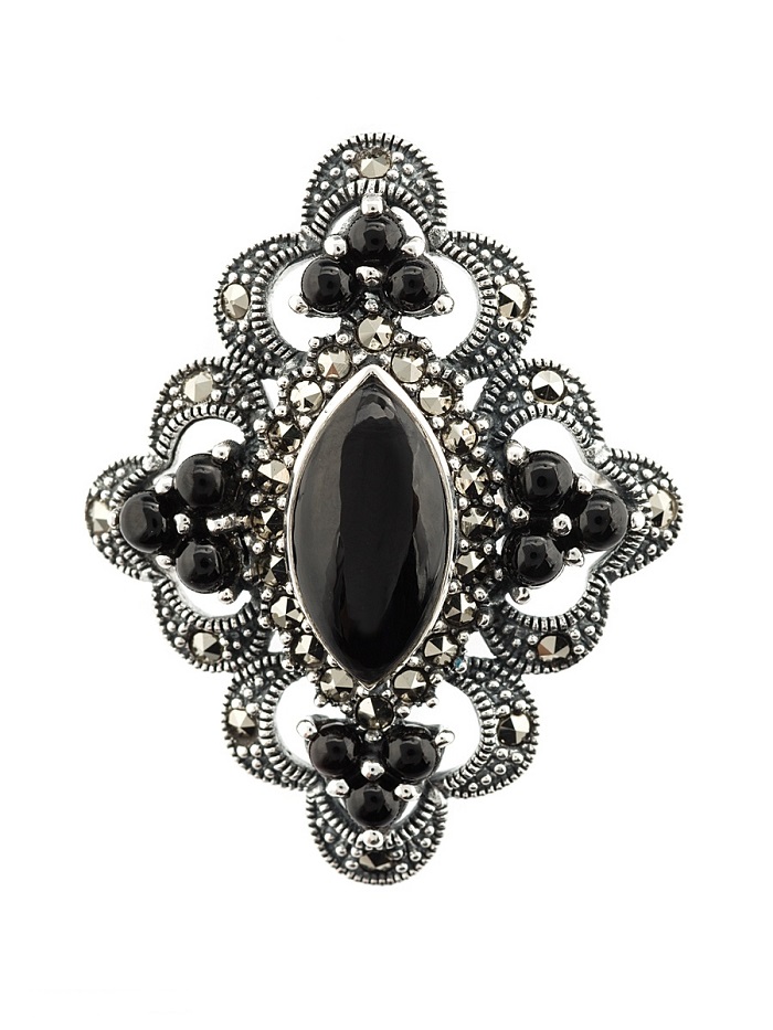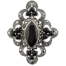 Unlike gold jewelery, where large sizes and excessive stone trimming may be suggestive of pretentiousness, silverware always looks fresh. The brooch perfectly harmonizes with multi-colored stones, and simply with rhinestones. The stone, framed with silver, is able to perfectly emphasize the color of the eyes, as well as give a unique metallic luster.