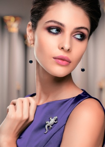Silver will look great on a purple background. The graceful lizard brooch in combination with ball earrings will create a unique evening look.