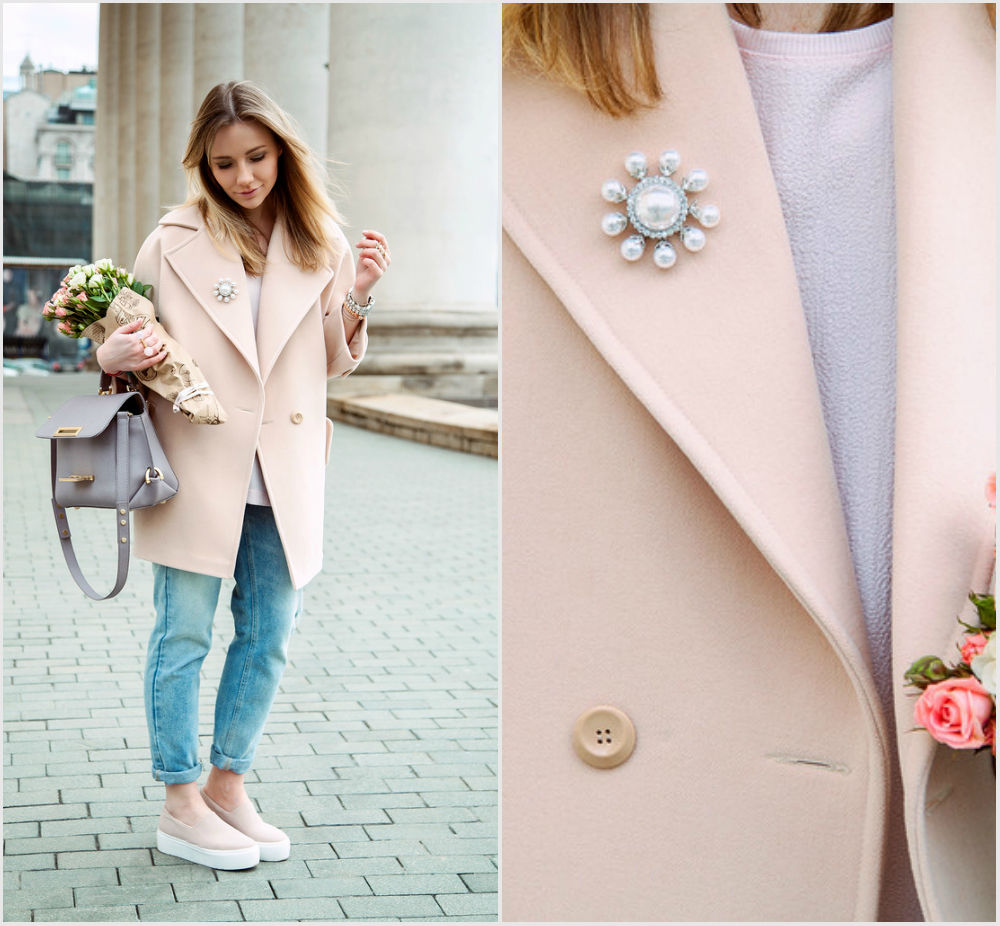 In autumn and winter, you can combine the brooch with a coat and jacket. Any color solutions will do, but it is worth remembering that the abundance of other decorations will look tasteless. It is better if the brooch will be your only highlight. However, in casual wearing several brooches is allowed, the main thing is to combine them in form and style.