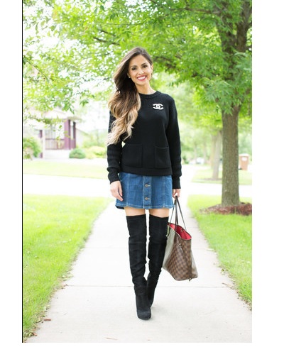 And for a leisurely city walk a combination of a black sweater and a denim skirt is perfect. You should choose high boots for shoes, and a medium-sized handbag for accessories. Silver brooch with the Chanel logo, perfectly fits to the bag of the same brand.