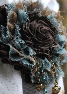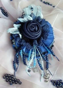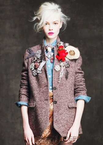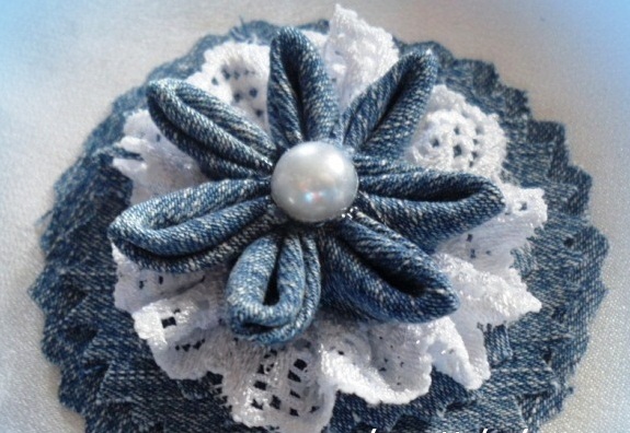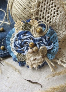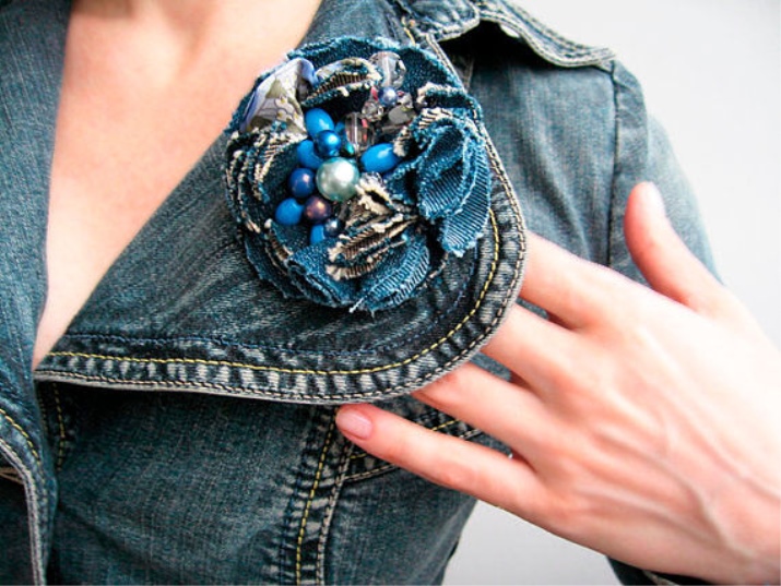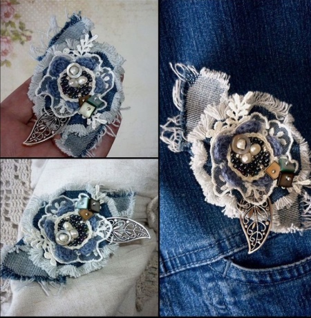 Especially nice look brooches in the form of roses, decorated with stones and beads. The simplest ones you can try to make yourself - for this you need only a little denim and decor. Beautifully drape the material, putting one layer on the other, to get a flower shape. After that, it remains only to beautifully decorate with small elements and rhinestones.