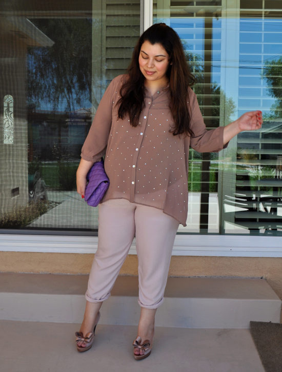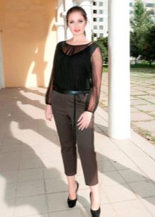 - 7/8 pants with high-heeled shoes will increase the height and make the figure slimmer, and an unusual blouse perfectly complements the image.