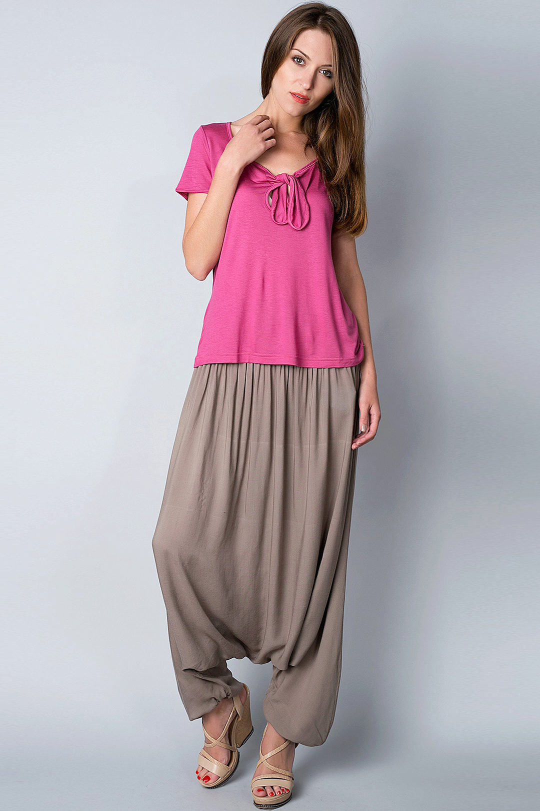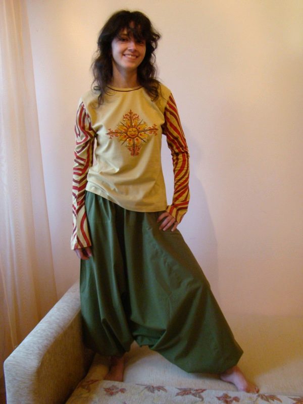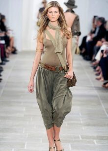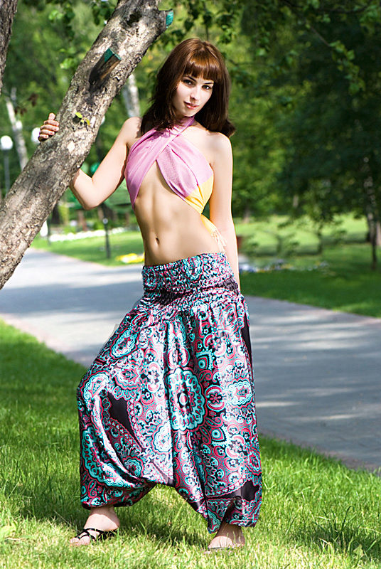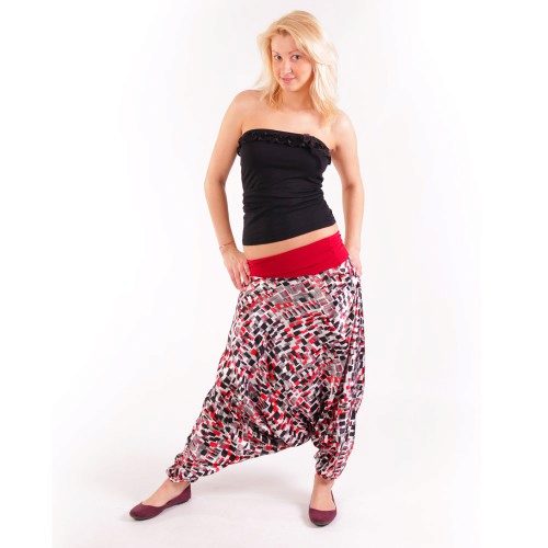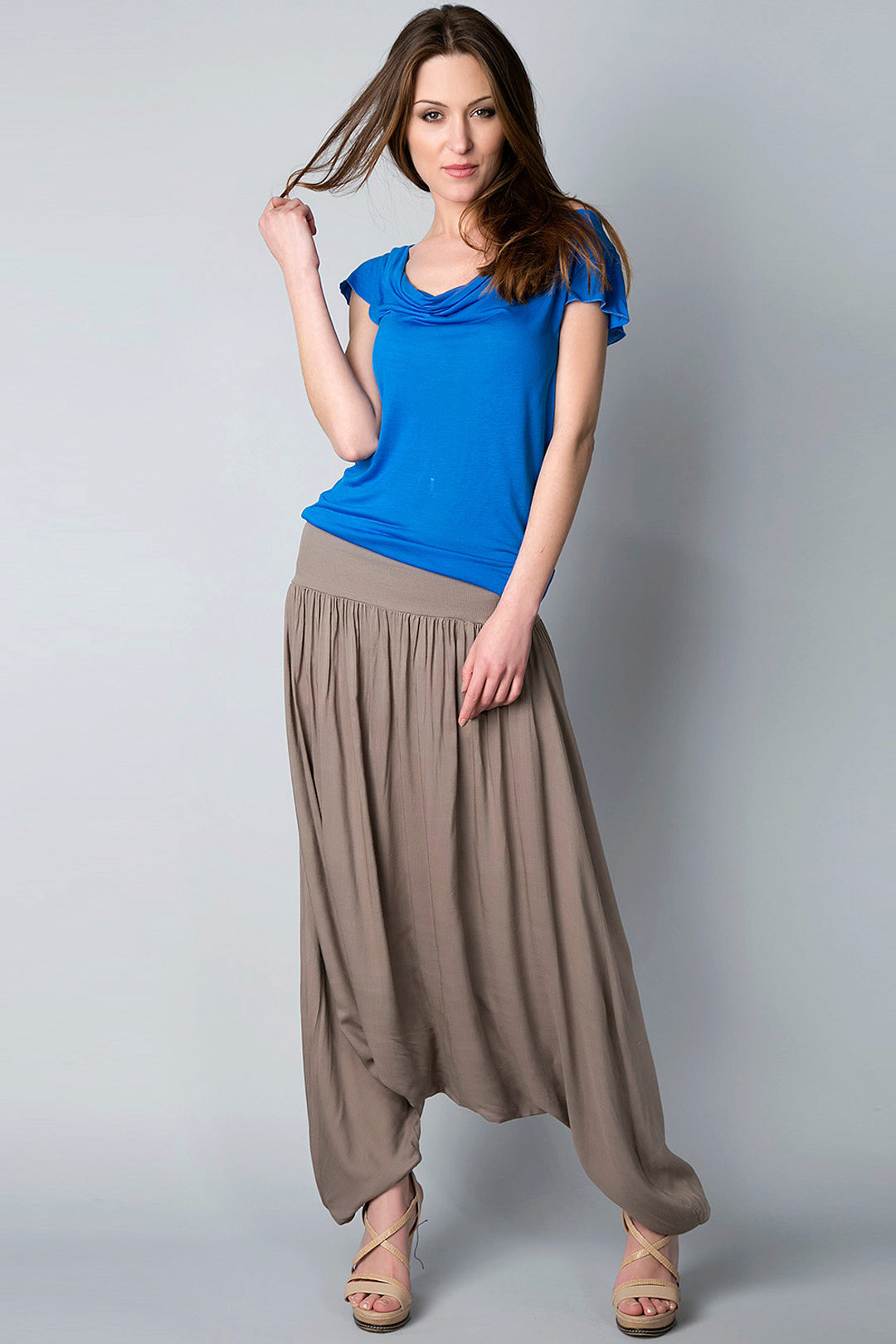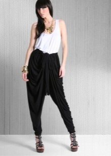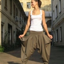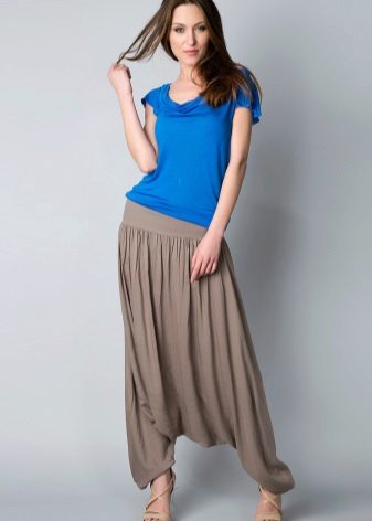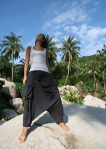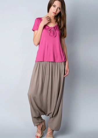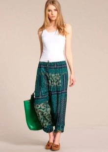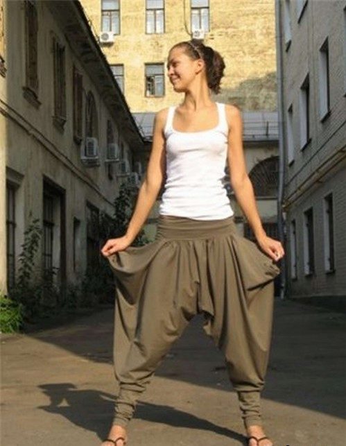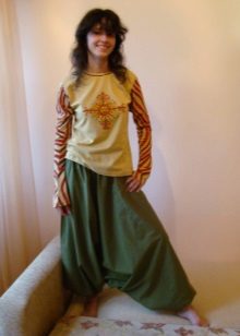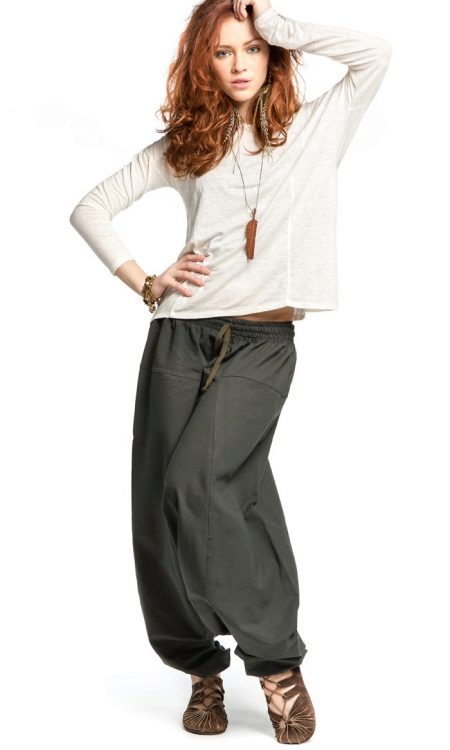 Another model is shortened Aladdin trousers, usually up to the knees. Often made of knitwear. Ideal for sports.